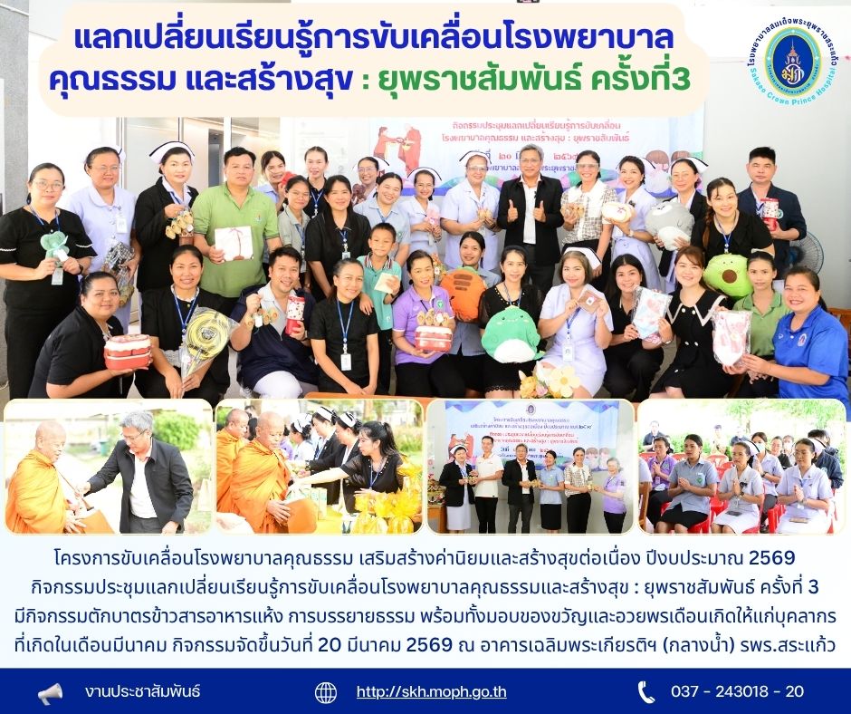 สุภาพร ภูจิตทอง ประชาสัมพันธ์กิจกรรมบริการ 20 March 2026 Hits: 4 โครงการขับเคลื่อนโรงพยาบาลคุณธรรม เสริมสร้างค่านิยม และสร้างสุขต่อเนื่อง ปีงบประมาณ พ.ศ.2569 กิจกรรมประชุมแลกเปลี่ยนเรียนรู้การขับเคลื่อนโรงพยาบาลคุณธรรม และสร้างสุข : ยุพราชสัมพันธ์ ครั้งที่ 3 Print Email