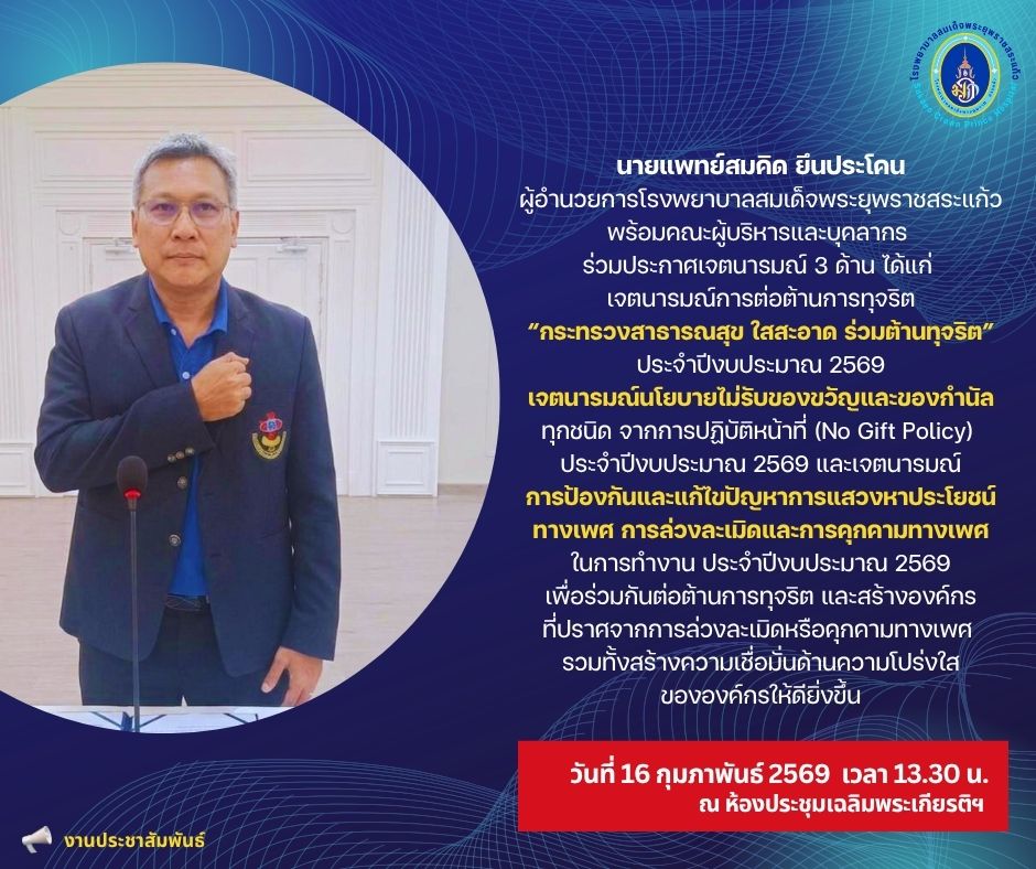 สุภาพร ภูจิตทอง ประชาสัมพันธ์กิจกรรมบริการ 20 March 2026 Hits: 2 ร่วมประกาศเจตนารมณ์ 3 ด้าน ประจำปีงบประมาณ พ.ศ. 2569 Print Email