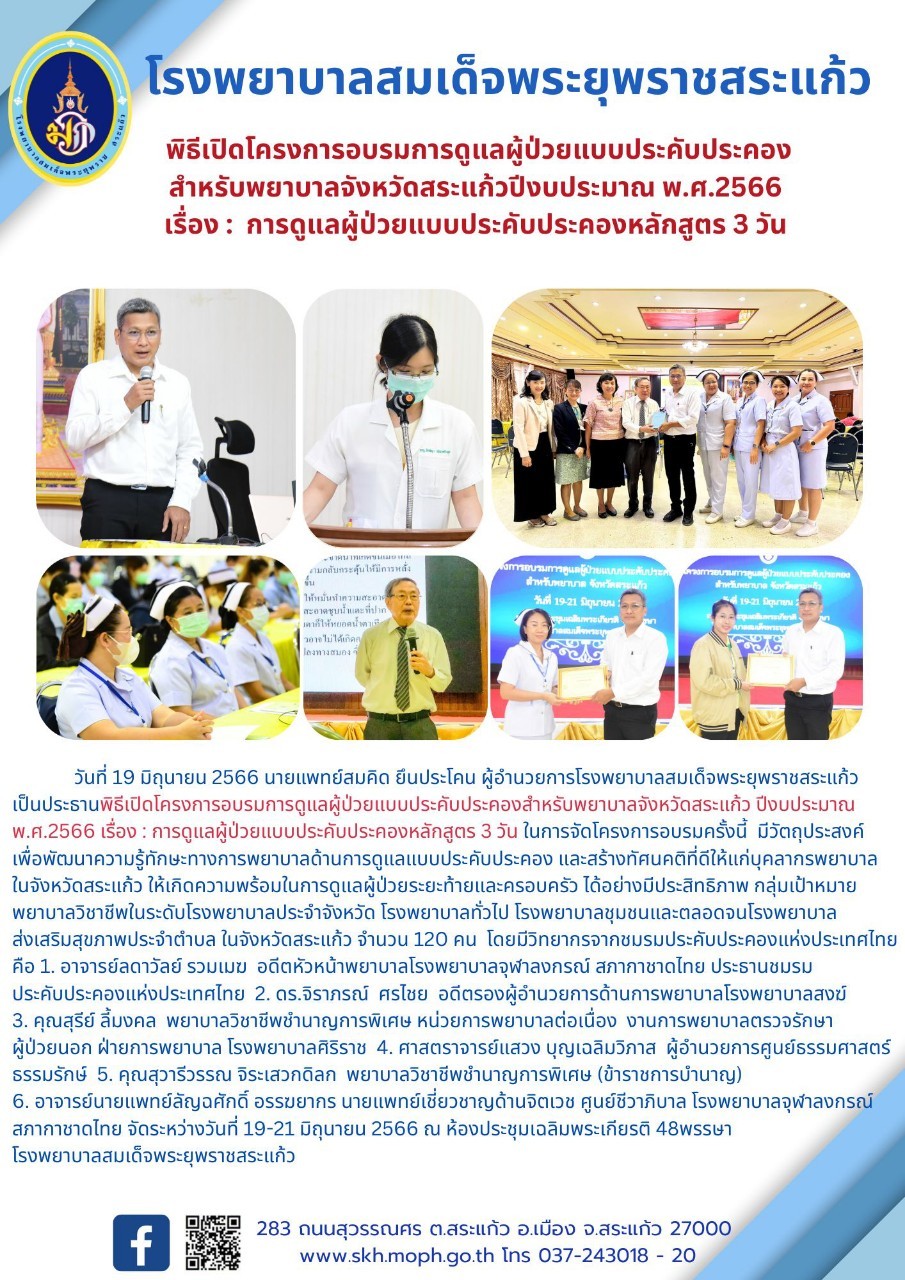 สุภาพร ภูจิตทอง ประชาสัมพันธ์กิจกรรมบริการ 29 June 2023 Hits: 25 พิธีเปิดโครงการอบรมการดูแลผู้ป่วยแบบประคับประคอง สำหรับพยาบาลจังหวัดสระแก้วมีงบประมาณพ.ศ 2566 เรื่อง : การดูแลผู้ป่วยแบบประคับประคองหลักสูตร 3 วัน Print Email Prev Next