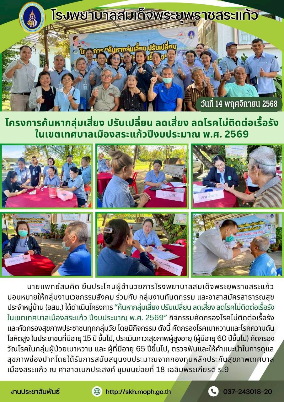 สุภาพร ภูจิตทอง ประชาสัมพันธ์กิจกรรมบริการ 14 November 2025 Hits: 217 โครงการ ค้นหากลุ่มเสี่ยง ปรับเปลี่ยน ลดเสี่ยง ลดโรคไม่ติดต่อเรื้อรัง ในเขตเทศบาลเมืองสระแก้ว ปีงบประมาณ พ.ศ. 2569 Print Email Prev Next