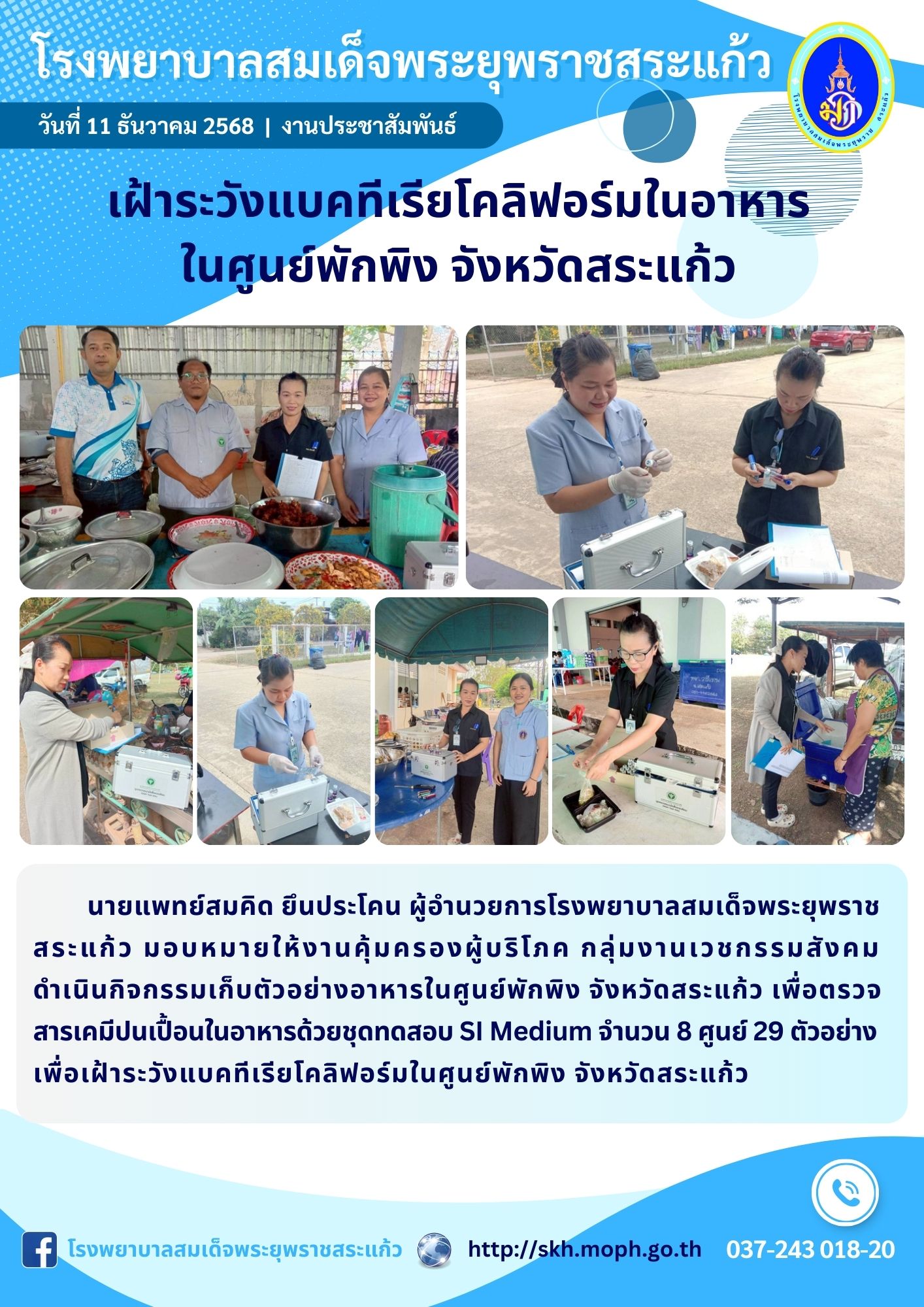 สุภาพร ภูจิตทอง ประชาสัมพันธ์กิจกรรมบริการ 16 December 2025 Hits: 904 เฝ้าระวังแบคทีเรียโคลิฟอร์มในอาหาร ในศูนย์พักพิง จังหวัดสระแก้ว Print Email Prev Next