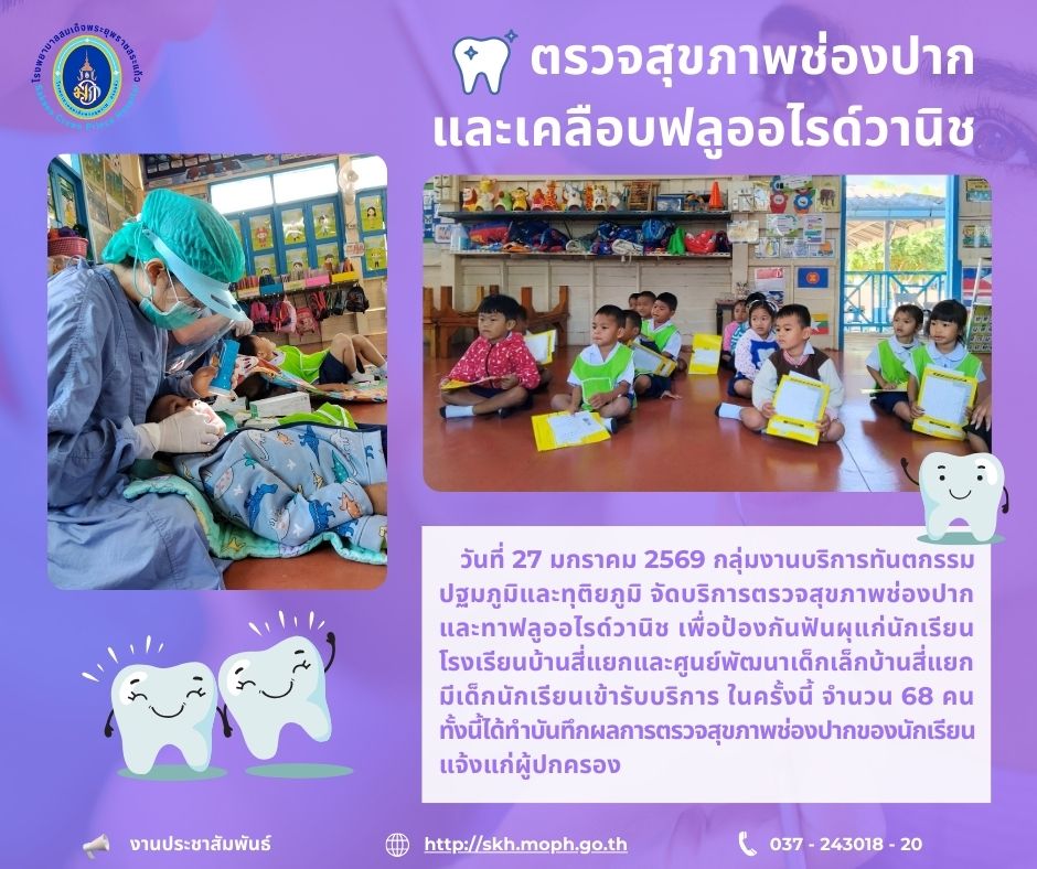 สุภาพร ภูจิตทอง ประชาสัมพันธ์กิจกรรมบริการ 28 January 2026 Hits: 1099 ตรวจสุขภาพช่องปาก และเคลือบฟลูออไรด์วานิช Print Email Prev Next