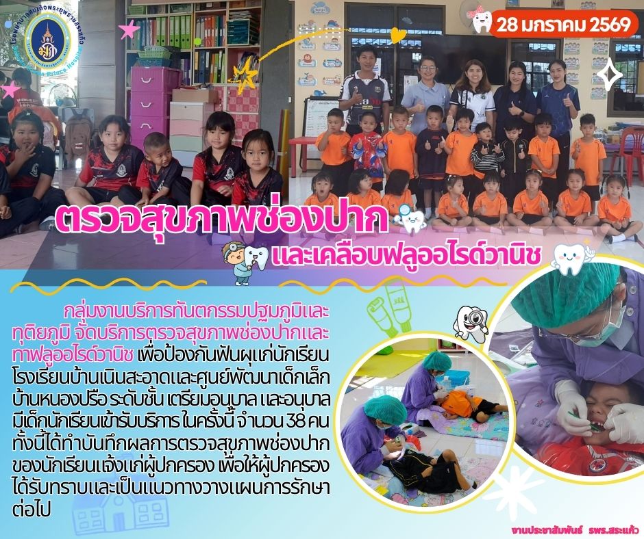 สุภาพร ภูจิตทอง ประชาสัมพันธ์กิจกรรมบริการ 28 January 2026 Hits: 1363 ตรวจสุขภาพช่องปาก และเคลือบฟลูออไรด์วานิช Print Email Prev Next