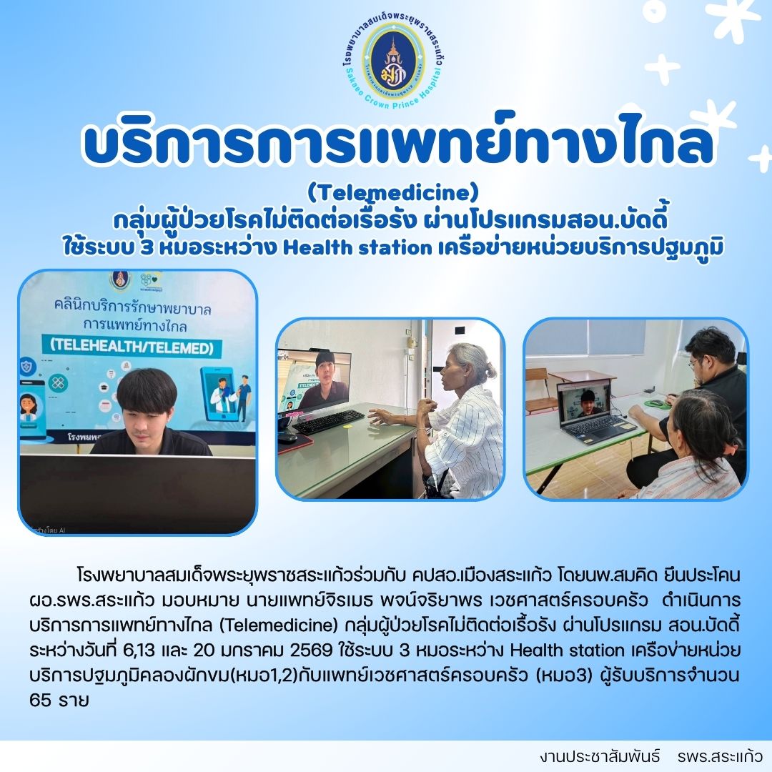 บริการการแพทย์ทางไกล(Telemedicine)กลุ่มผู้ป่วยโรคไม่ติดต่อเรื้อรัง ผ่านโปรแกรม สอน.บัดดี้ ใช้ระบบ 3 หมอระหว่าง Health station เครือข่ายหน่วยบริการปฐมภูมิ
