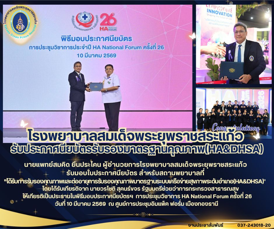 สุภาพร ภูจิตทอง ประชาสัมพันธ์กิจกรรมบริการ 12 March 2026 Hits: 16 รับประกาศนียบัตรรับรองมาตรฐานคุณภาพ (HA&DHSA) Print Email Prev Next