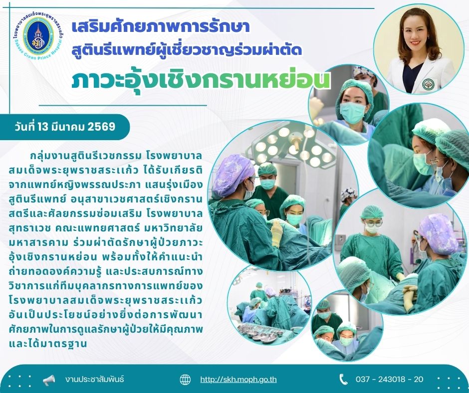 สุภาพร ภูจิตทอง ประชาสัมพันธ์กิจกรรมบริการ 16 March 2026 Hits: 5 เสริมศักยภาพการรักษา สูตินรีแพทย์ผู้เชี่ยวชาญร่วมผ่าตัดภาวะอุ้งเชิงกรานหย่อน Print Email Prev Next