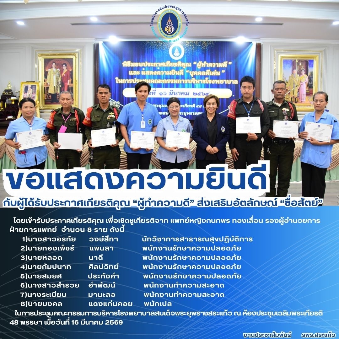 สุภาพร ภูจิตทอง ประชาสัมพันธ์กิจกรรมบริการ 16 March 2026 Hits: 3 ขอแสดงความยินดี กับผู้ได้รับประกาศเกียรติคุณ “ผู้ทำความดี” ส่งเสริมอัตลักษณ์ “ซื่อสัตย์” Print Email Prev Next