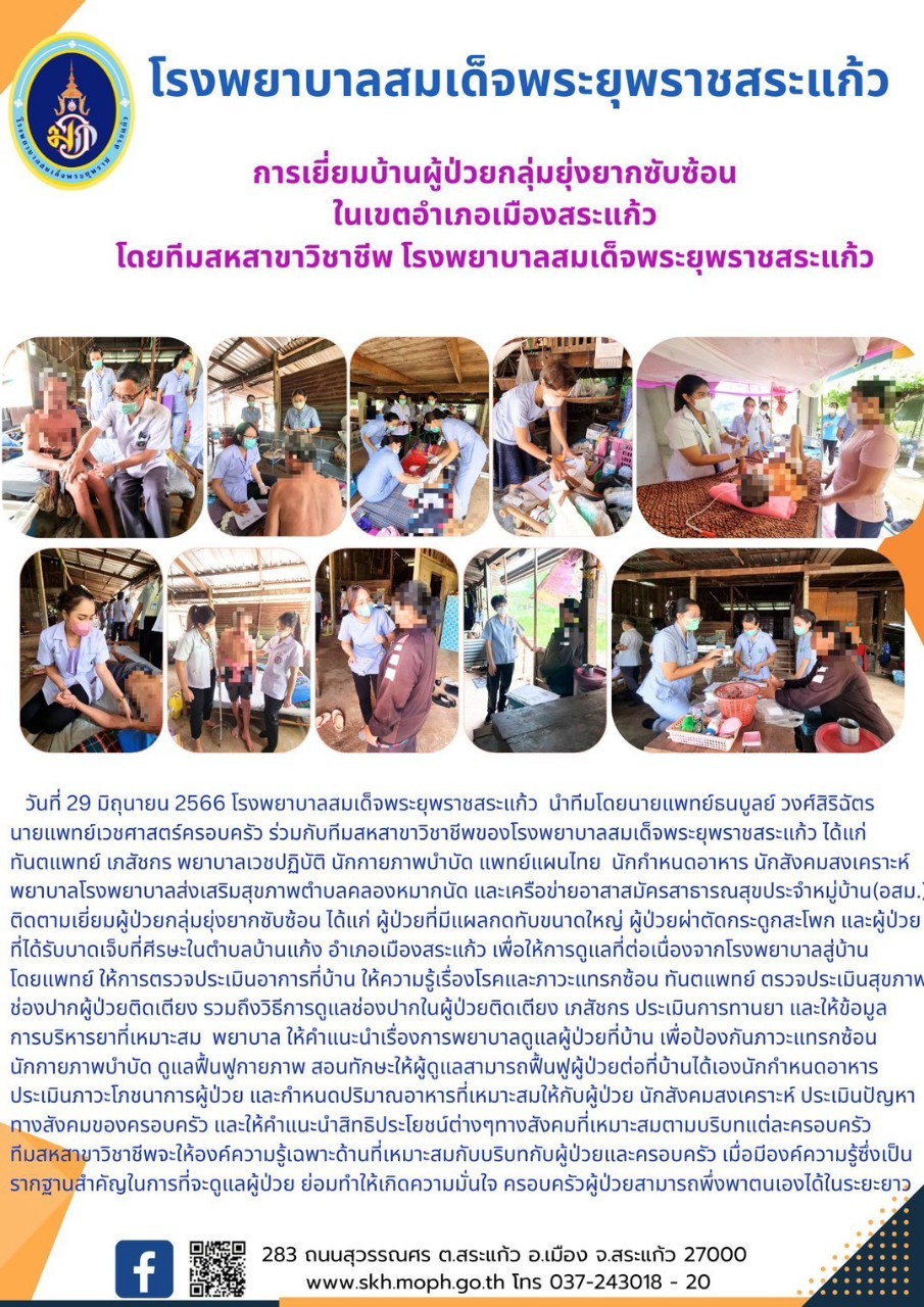 สุภาพร ภูจิตทอง ประชาสัมพันธ์กิจกรรมบริการ 03 July 2023 Hits: 23 การเยี่ยมบ้านผู้ป่วยกลุ่มยุ่งยากซับซ้อนในเขตอำเภอเมืองสระแก้ว โดยทีมสหสาขาวิชาชีพ โรงพยาบาลสมเด็จพระยุพราชสระแก้ว Print Email