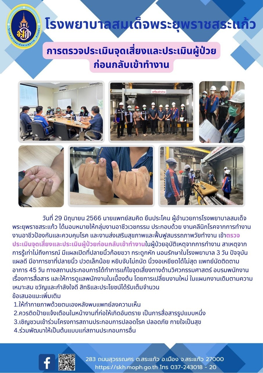 สุภาพร ภูจิตทอง ประชาสัมพันธ์กิจกรรมบริการ 03 July 2023 Hits: 17 การตรวจประเมินจุดเสี่ยงและประเมินผู้ป่วย ก่อนกลับเข้าทำงาน Print Email