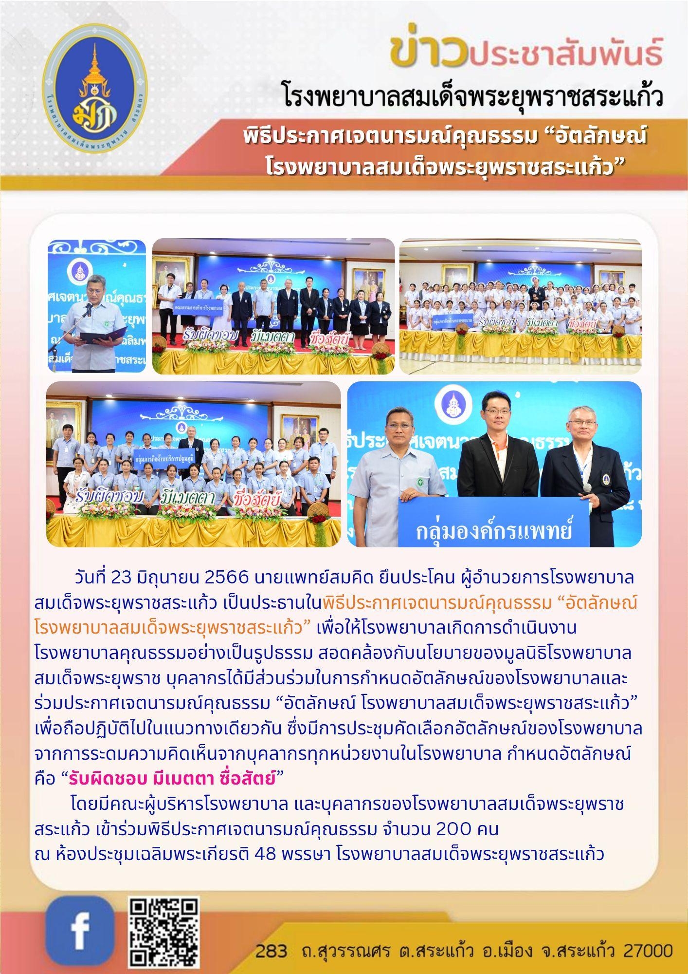 สุภาพร ภูจิตทอง ประชาสัมพันธ์กิจกรรมบริการ 29 June 2023 Hits: 44 พิธีประกาศเจตนารมณ์คุณธรรม " อัตลักษณ์โรงพยาบาลสมเด็จพระยุพราชสระแก้ว " Print Email