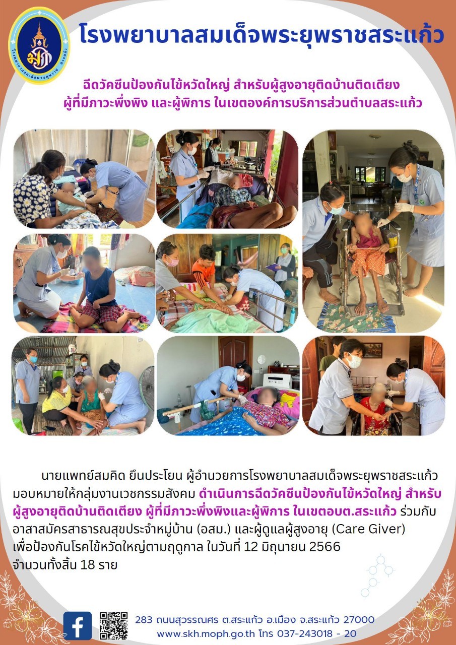 สุภาพร ภูจิตทอง ประชาสัมพันธ์กิจกรรมบริการ 16 June 2023 Hits: 25 ฉีดวัคซีนป้องกันไข้หวัดใหญ่ สำหรับผู้สูงอายุติดบ้านติดเตียง ผู้ที่มีภาวะพึ่งพิง และผู้พิการ ในเขตองค์การบริหารส่วนตำบลสระแก้ว Print Email