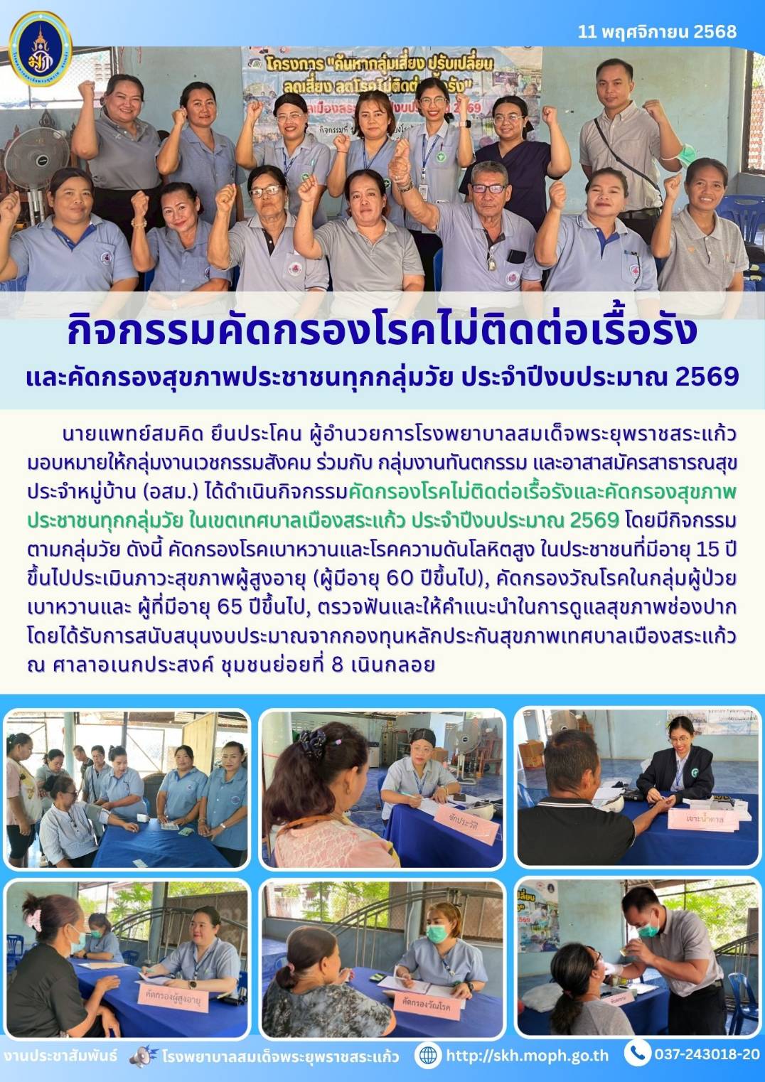 สุภาพร ภูจิตทอง ประชาสัมพันธ์กิจกรรมบริการ 14 November 2025 Hits: 6 กิจกรรมคัดกรองโรคไม่ติดต่อเรื้อรัง และคัดกรองสุขภาพประชาชนทุกกลุ่มวัย ประจำปีงบประมาณ 2569 Print Email