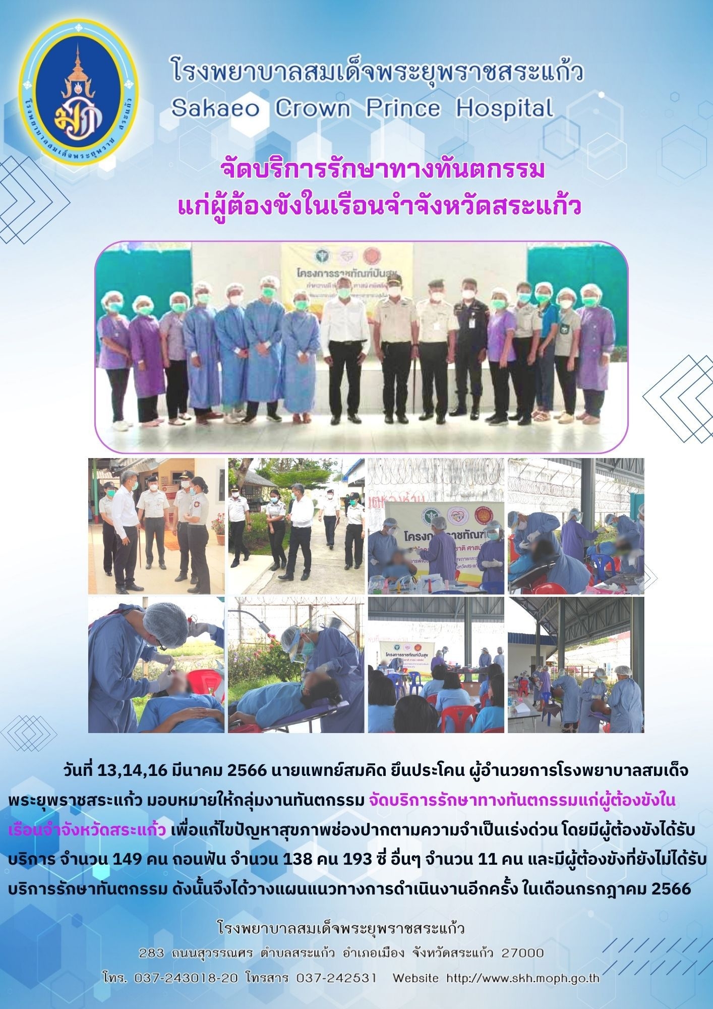 สุภาพร ภูจิตทอง ประชาสัมพันธ์กิจกรรมบริการ 20 March 2023 Hits: 29 จัดบริการรักษาทางทันตกรรมแก่ผู้ต้องขังในเรือนจำจังหวัดสระแก้ว Print Email
