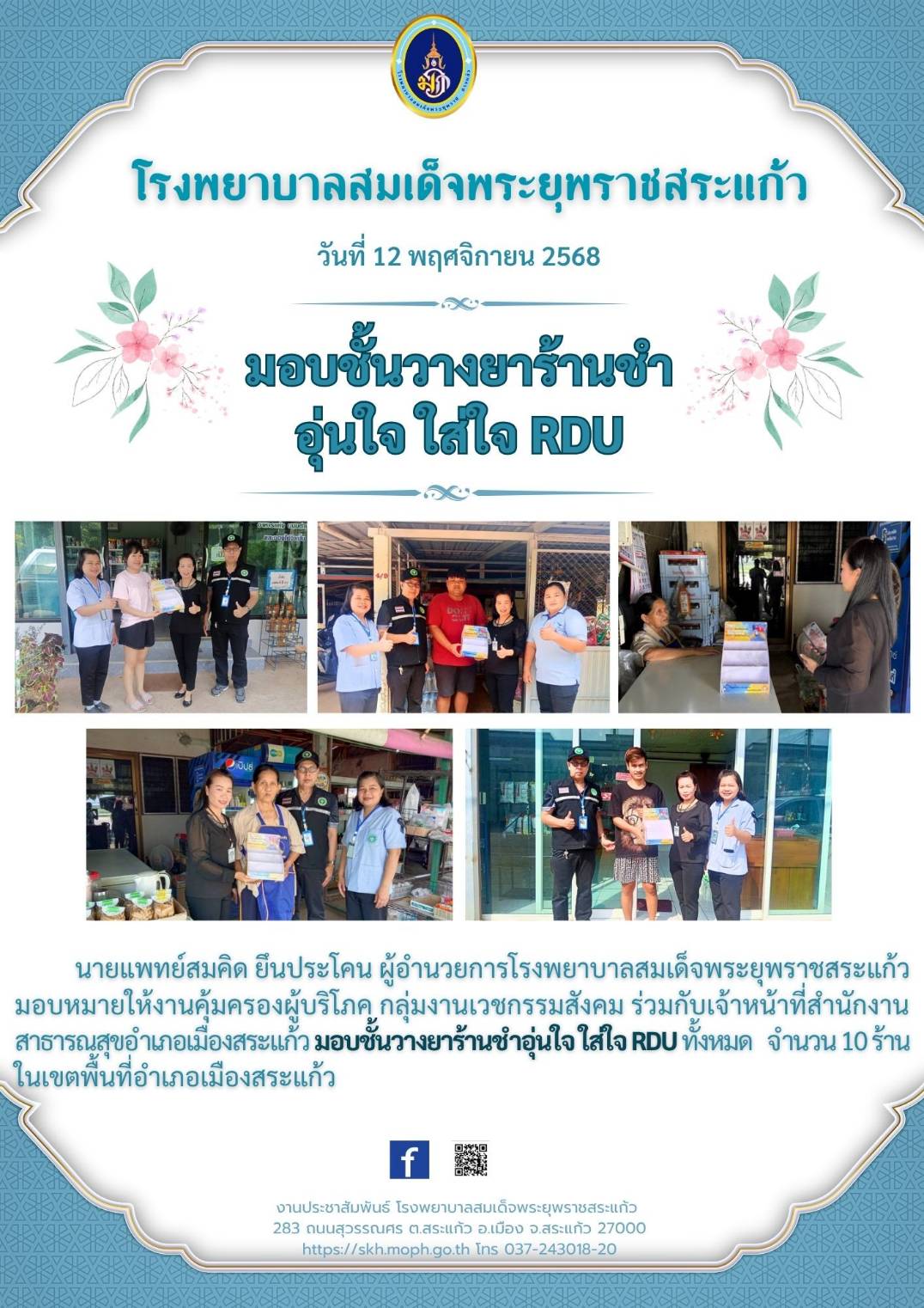 สุภาพร ภูจิตทอง ประชาสัมพันธ์กิจกรรมบริการ 14 November 2025 Hits: 6 มอบชั้นวางยาร้านชำ อุ่นใจ ใส่ใจ RDU Print Email
