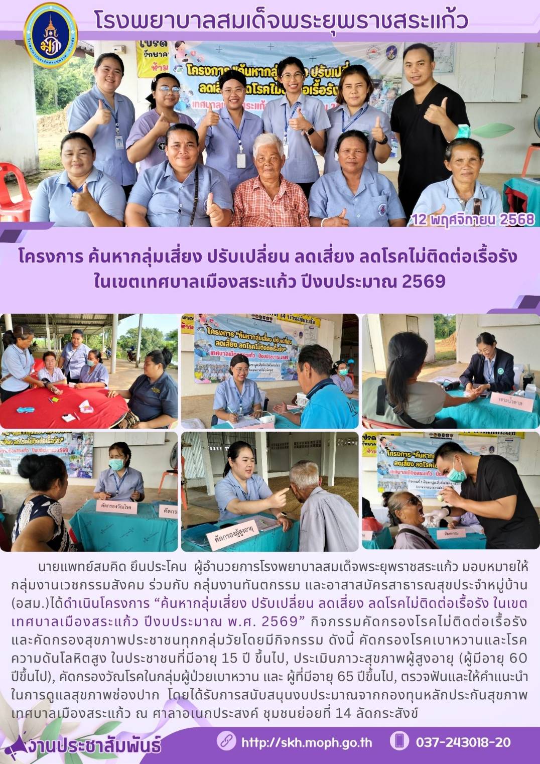 สุภาพร ภูจิตทอง ประชาสัมพันธ์กิจกรรมบริการ 14 November 2025 Hits: 9 โครงการ ค้นหากลุ่มเสี่ยง ปรับเปลี่ยน ลดเสี่ยง ลดโรคไม่ติดต่อเรื้อรัง ในเขตเทศบาลเมืองสระแก้ว ปีงบประมาณ 2569 Print Email