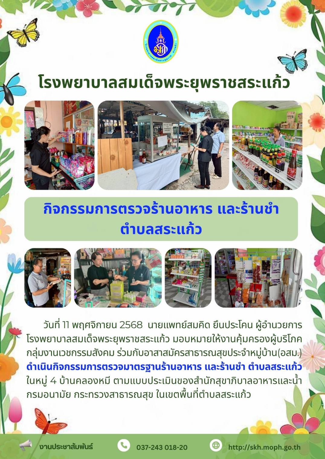 สุภาพร ภูจิตทอง ประชาสัมพันธ์กิจกรรมบริการ 14 November 2025 Hits: 6 กิจกรรมการตรวจร้านอาหาร และร้านชำ ตำบลสระแก้ว Print Email