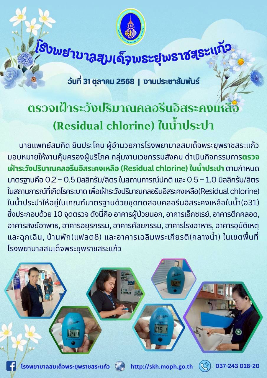 สุภาพร ภูจิตทอง ประชาสัมพันธ์กิจกรรมบริการ 03 November 2025 Hits: 7 ตรวจเฝ้าระวังปริมาณคลอรีนอิสระคงเหลือ ในน้ำประปา Print Email