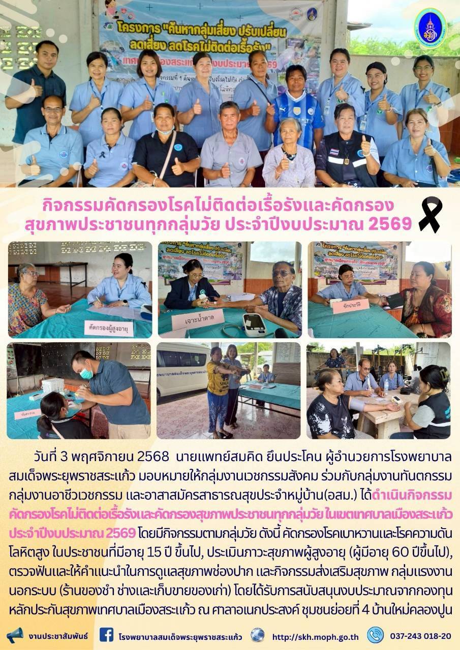 สุภาพร ภูจิตทอง ประชาสัมพันธ์กิจกรรมบริการ 12 November 2025 Hits: 6 กิจกรรมคัดกรองโรคไม่ติดต่อเรื้อรัง และคัดกรองสุขภาพประชาชนทุกกลุ่มวัย ประจำปีงบประมาณ 2569 Print Email