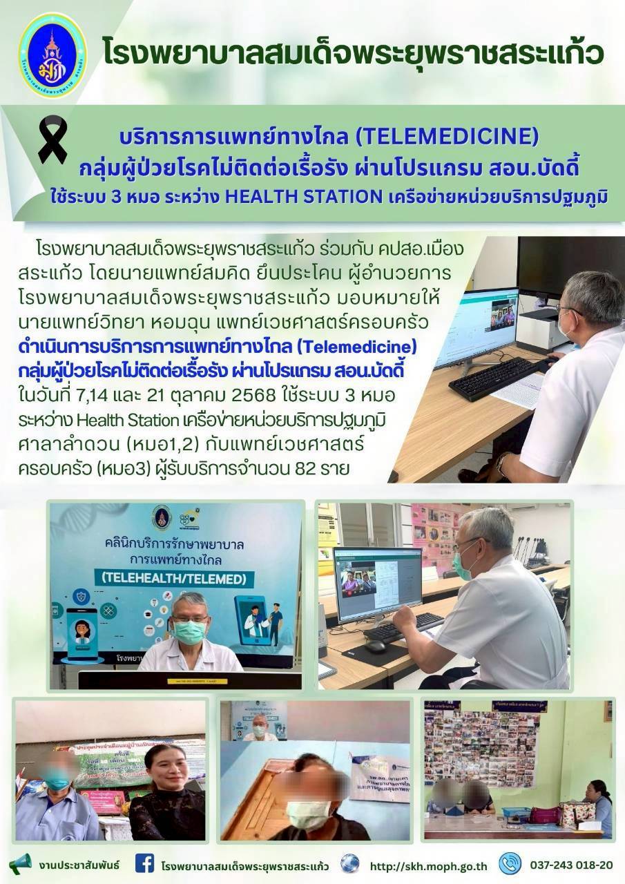 สุภาพร ภูจิตทอง ประชาสัมพันธ์กิจกรรมบริการ 12 November 2025 Hits: 5 บริการการแพทย์ทางไกล (Telemedicine) กลุ่มผู้ป่วยโรคไม่ติดต่อเรื้อรัง ผ่านโปรแกรม สอน.บัดดี้ ใช้ระบบ 3 หมอ ระหว่าง Health station เครือข่ายหน่วยบริการปฐมภูมิศาลาลำดวน Print Email