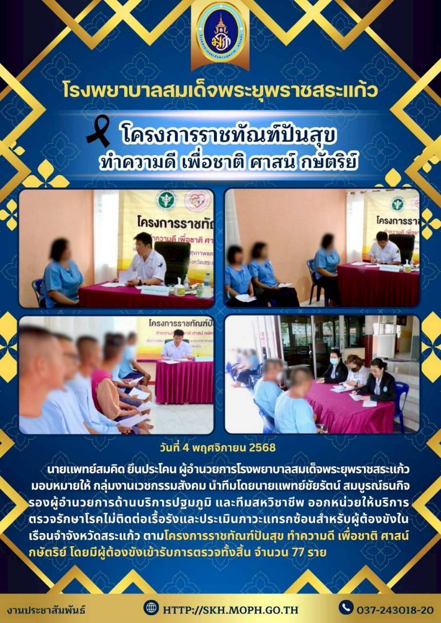 สุภาพร ภูจิตทอง ประชาสัมพันธ์กิจกรรมบริการ 12 November 2025 Hits: 5 โครงการราชทัณฑ์ปันสุข ทำความดี เพื่อชาติ ศาสน์ กษัตริย์ Print Email