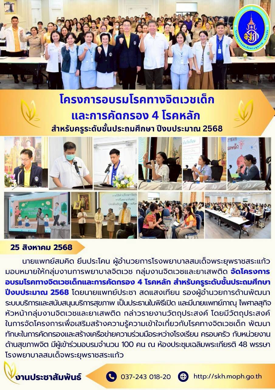 สุภาพร ภูจิตทอง ประชาสัมพันธ์กิจกรรมบริการ 26 September 2025 Hits: 9 โครงการอบรมโรคทางจิตเวชเด็ก และการคัดกรอง 4 โรคหลัก สำหรับครูระดับชั้นประถมศึกษา ปีงบประมาณ 2568 Print Email