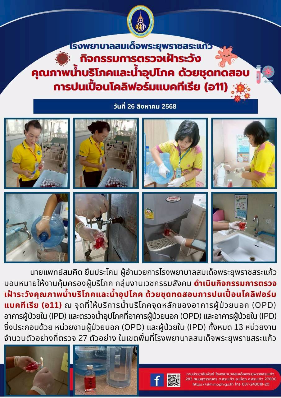 สุภาพร ภูจิตทอง ประชาสัมพันธ์กิจกรรมบริการ 30 September 2025 Hits: 8 กิจกรรมการตรวจเฝ้าระวังคุณภาพน้ำบริโภคและน้ำอุปโภค ด้วยชุดทดสอบการปนเปื้อนโคลิฟอร์มแบคทีเรีย (อ11) Print Email