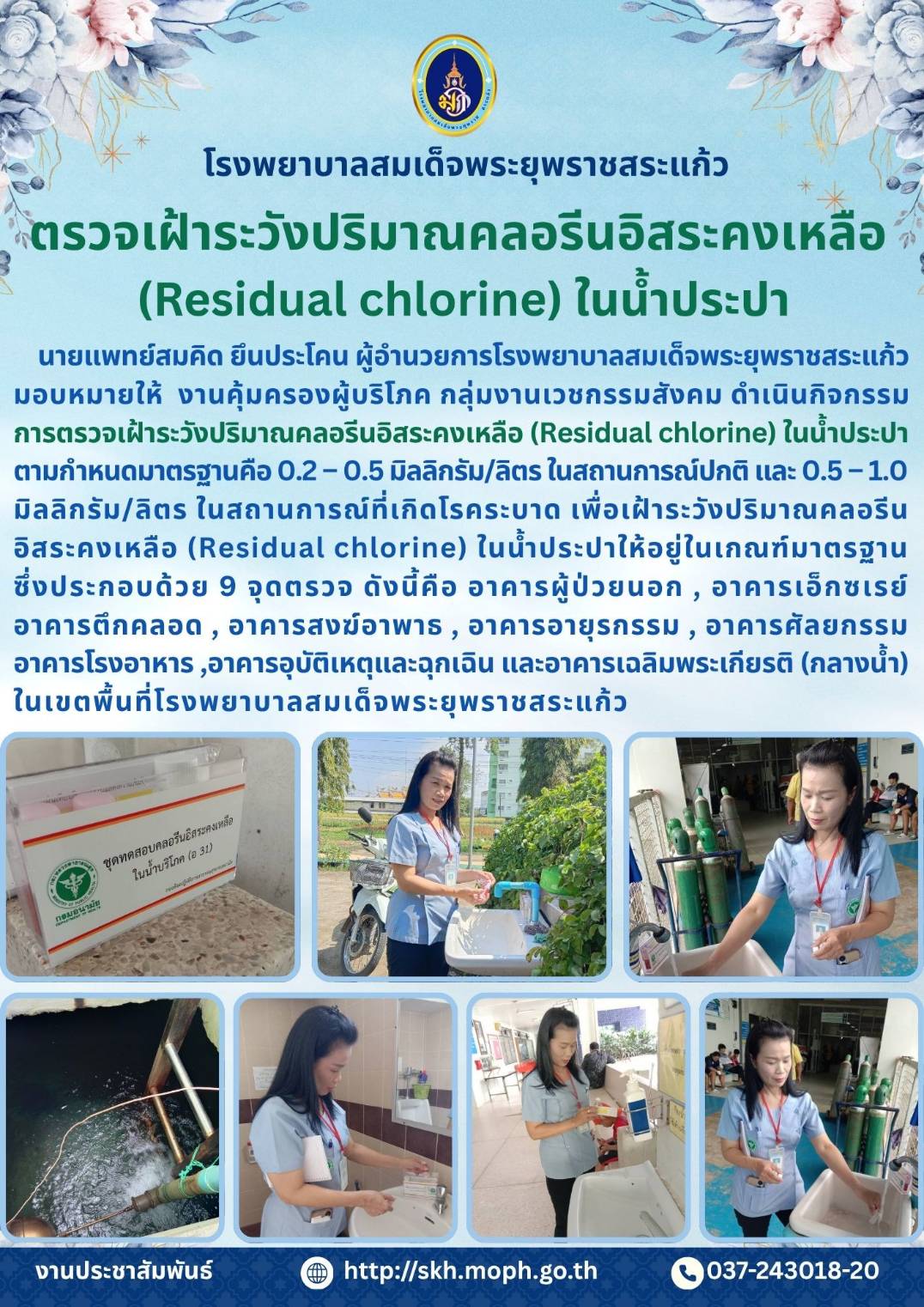 สุภาพร ภูจิตทอง ประชาสัมพันธ์กิจกรรมบริการ 10 October 2025 Hits: 4 ตรวจเฝ้าระวังปริมาณคลอรีนอิสระคงเหลือ (Residual chlorine) ในน้ำประปา Print Email