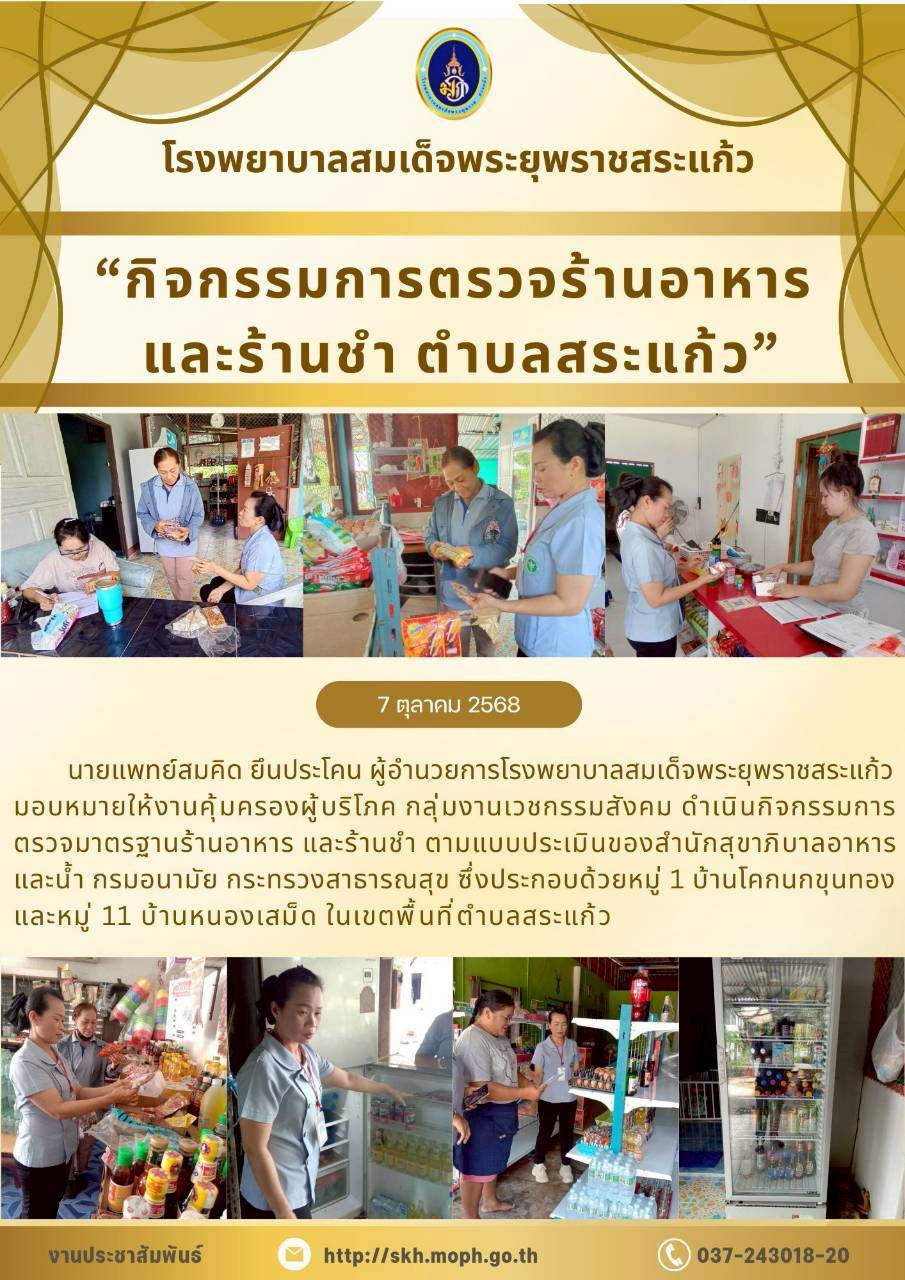 สุภาพร ภูจิตทอง ประชาสัมพันธ์กิจกรรมบริการ 14 October 2025 Hits: 3 กิจกรรมการตรวจร้านอาหาร และร้านชำ ตำบลสระแก้ว Print Email
