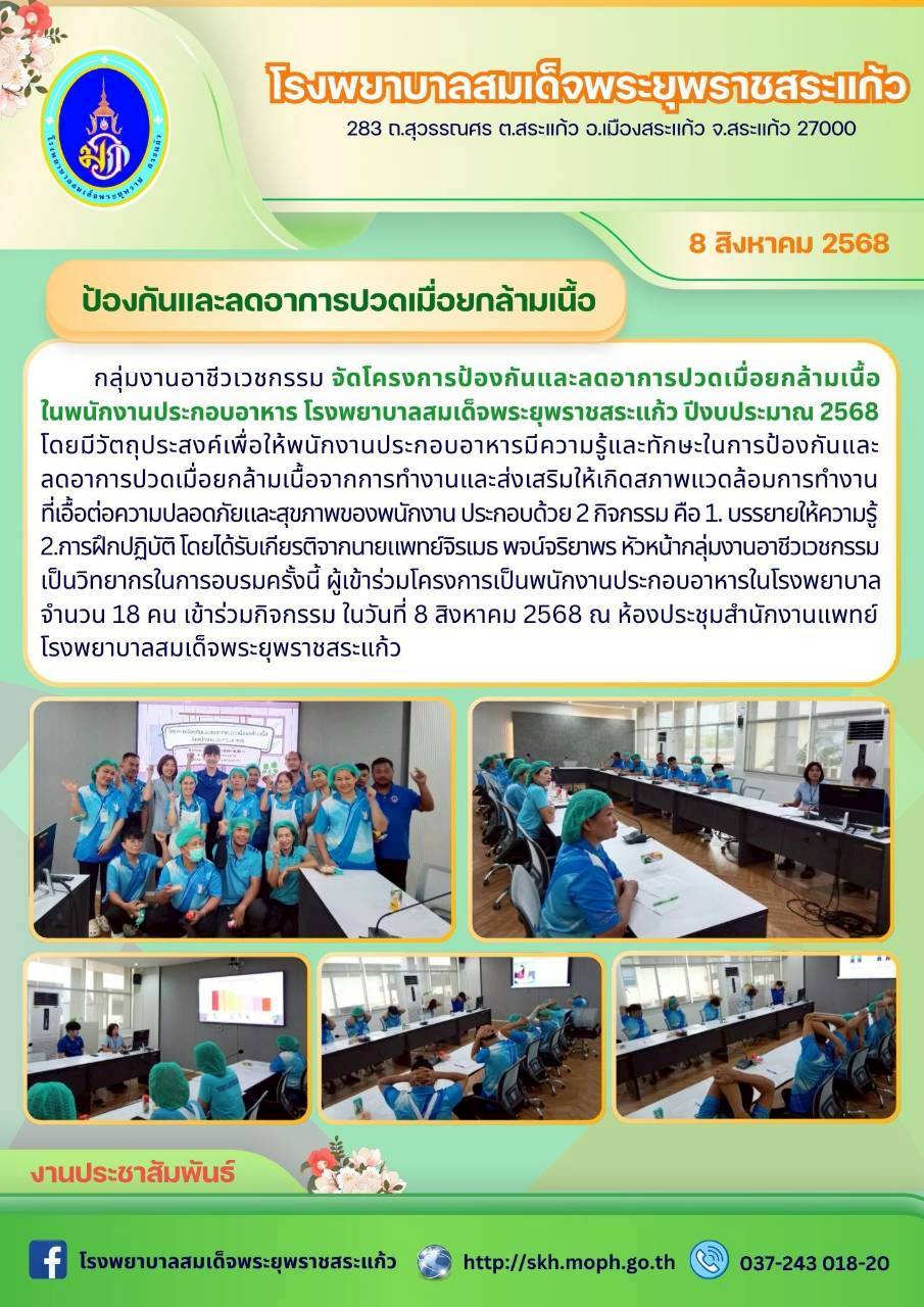สุภาพร ภูจิตทอง ประชาสัมพันธ์กิจกรรมบริการ 25 September 2025 Hits: 5 โครงการป้องกันและลดอาการปวดเมื่อยกล้ามเนื้อในพนักงานประกอบอาหาร Print Email