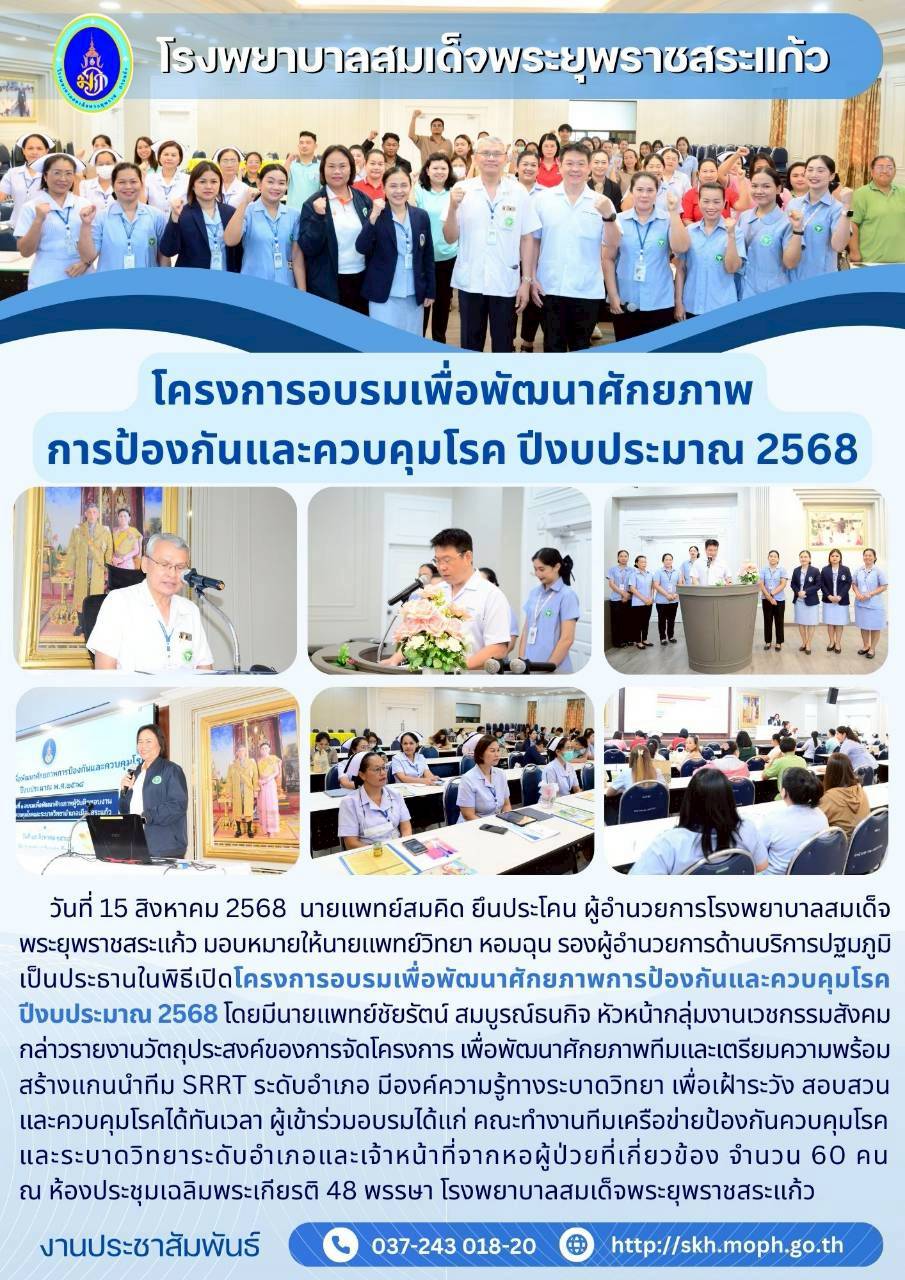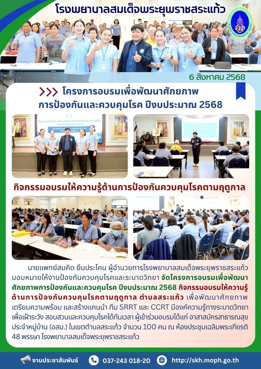 สุภาพร ภูจิตทอง ประชาสัมพันธ์กิจกรรมบริการ 25 September 2025 Hits: 4 โครงการอบรมเพื่อพัฒนาศักยภาพ การป้องกันและควบคุมโรค ปีงบประมาณ 2568 Print Email