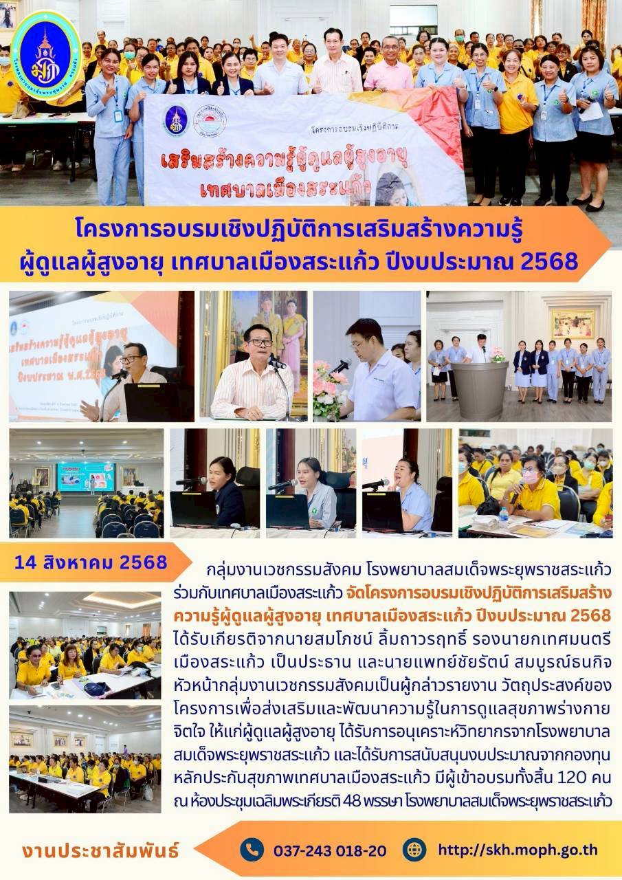 สุภาพร ภูจิตทอง ประชาสัมพันธ์กิจกรรมบริการ 25 September 2025 Hits: 5 โครงการอบรมเชิงปฏิบัติการเสริมสร้างความรู้ ผู้ดูแลผู้สูงอายุ เทศบาลเมืองสระแก้ว ปีงบประมาณ 2568 Print Email