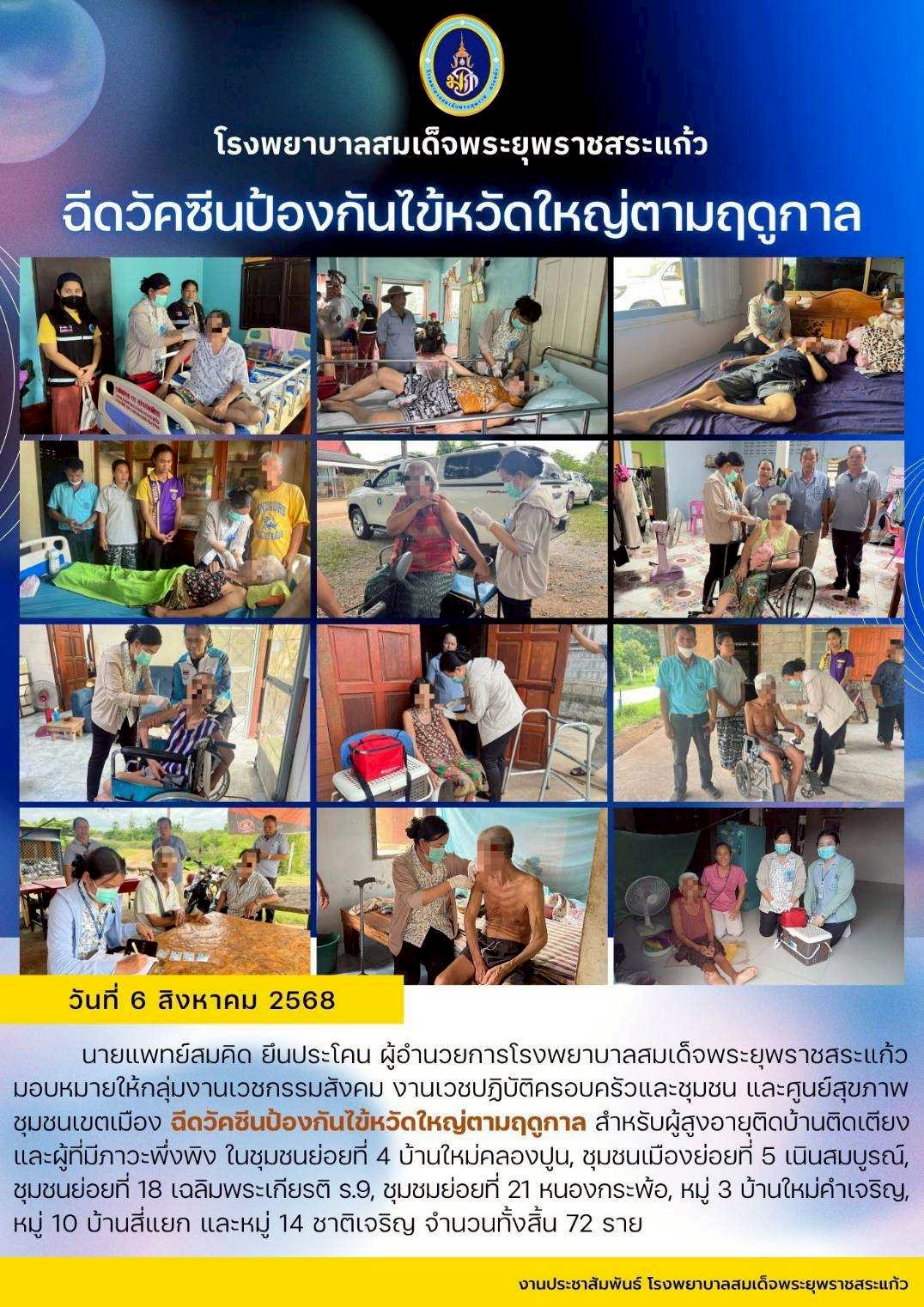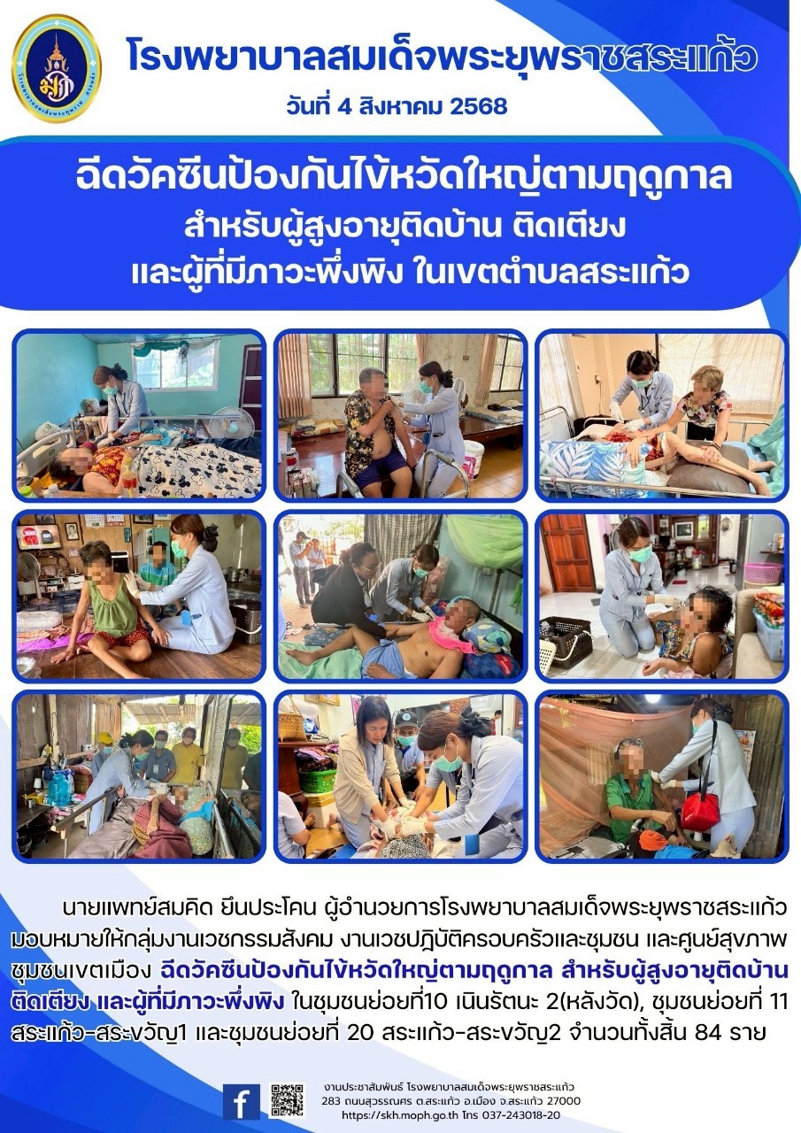 สุภาพร ภูจิตทอง ประชาสัมพันธ์กิจกรรมบริการ 25 September 2025 Hits: 3 ฉีดวัคซีนป้องกันไข้หวัดใหญ่ตามฤดูกาล สำหรับผู้สูงอายุติดบ้าน ติดเตียง และผู้ที่มีภาวะพึ่งพิง ในเขตตำบลสระแก้ว Print Email