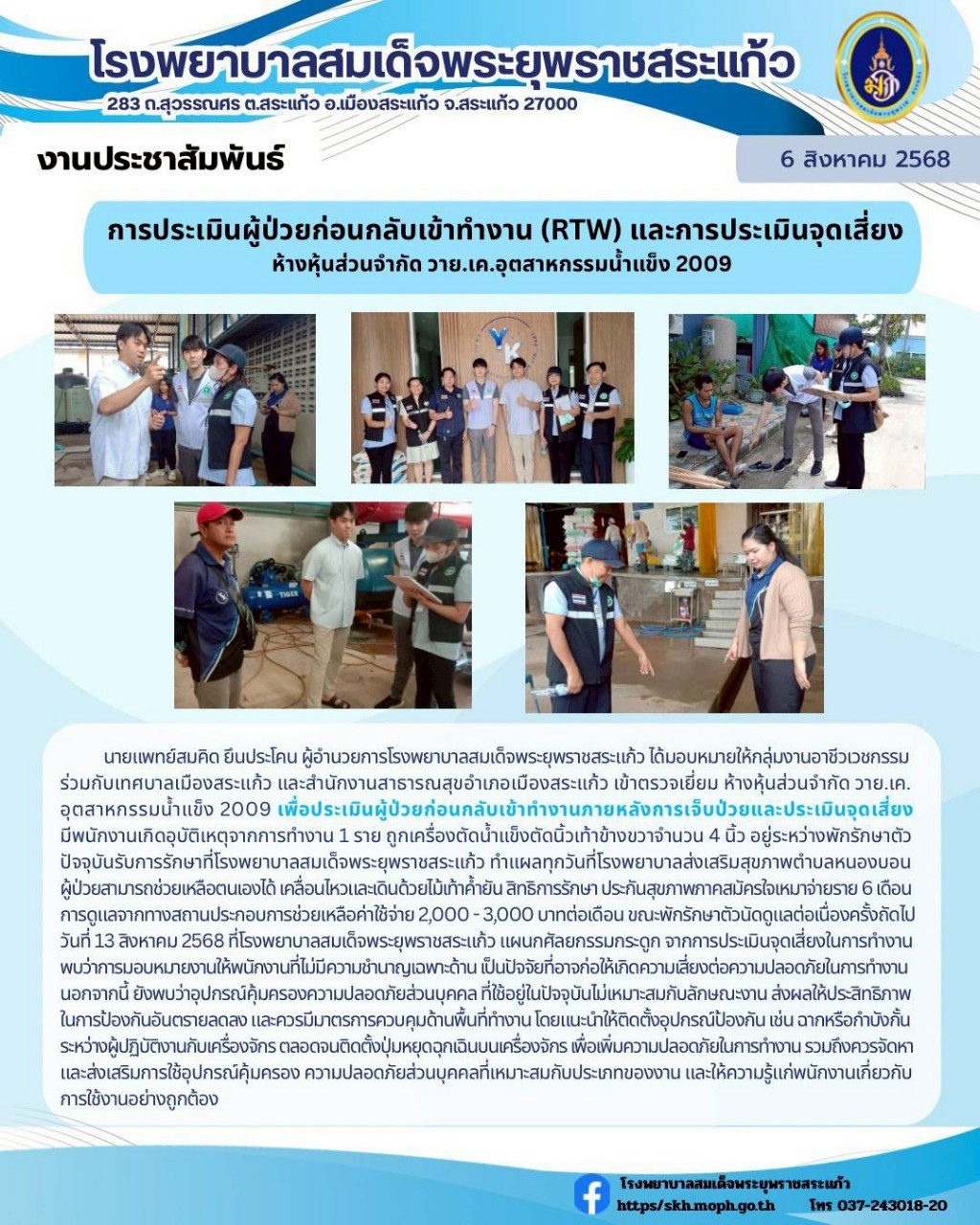 สุภาพร ภูจิตทอง ประชาสัมพันธ์กิจกรรมบริการ 25 September 2025 Hits: 6 การประเมินผู้ป่วยก่อนกลับเข้าทำงาน (RTW) และการประเมินจุดเสี่ยง Print Email