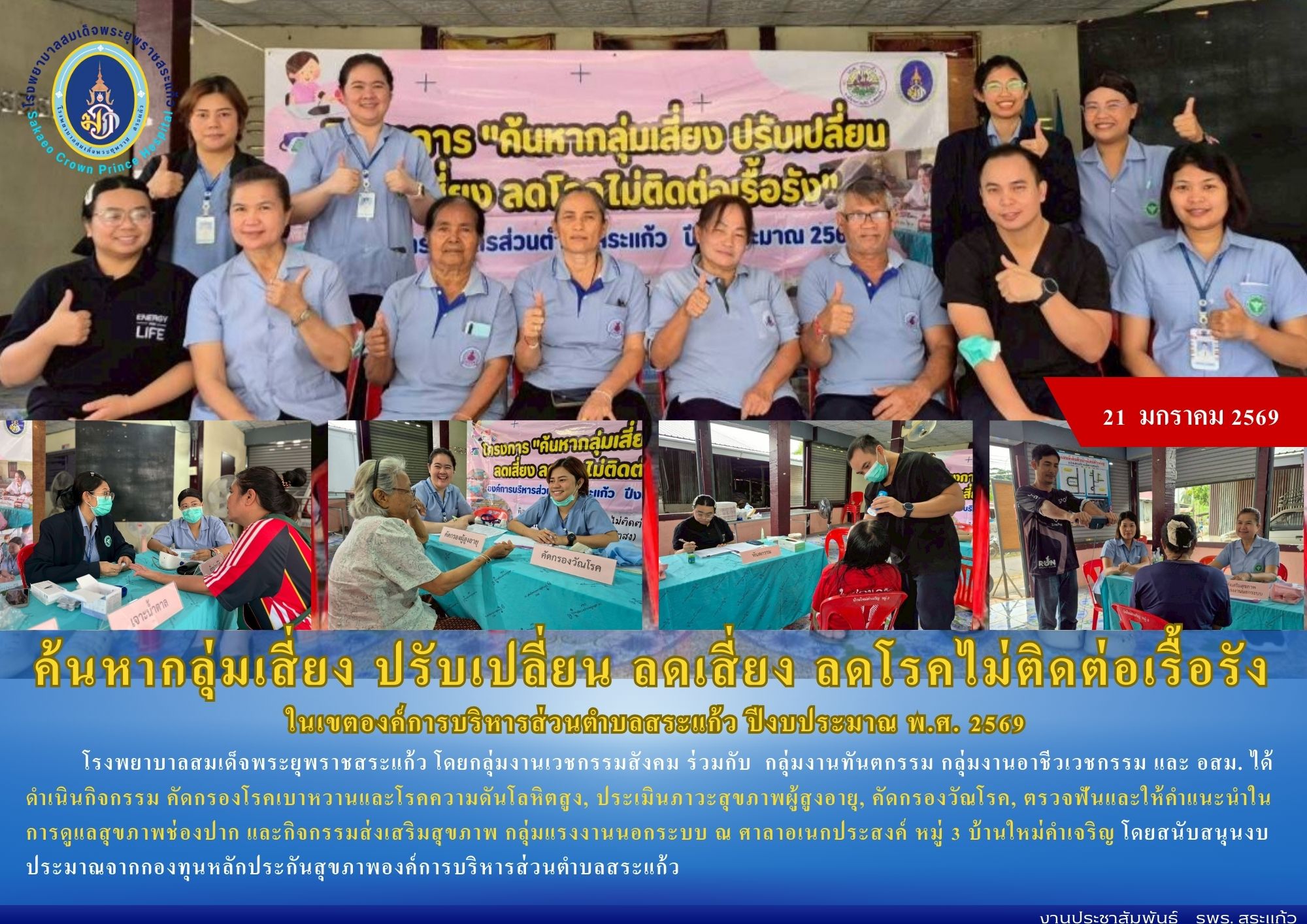 สุภาพร ภูจิตทอง ประชาสัมพันธ์กิจกรรมบริการ 21 January 2026 Hits: 1131 โครงการ ค้นหากลุ่มเสี่ยง ปรับเปลี่ยน ลดเสี่ยง ลดโรคไม่ติดต่อเรื้อรัง ในเขตองค์การบริหารส่วนตำบลสระแก้ว ปีงบประมาณ พ.ศ. 2569 Print Email