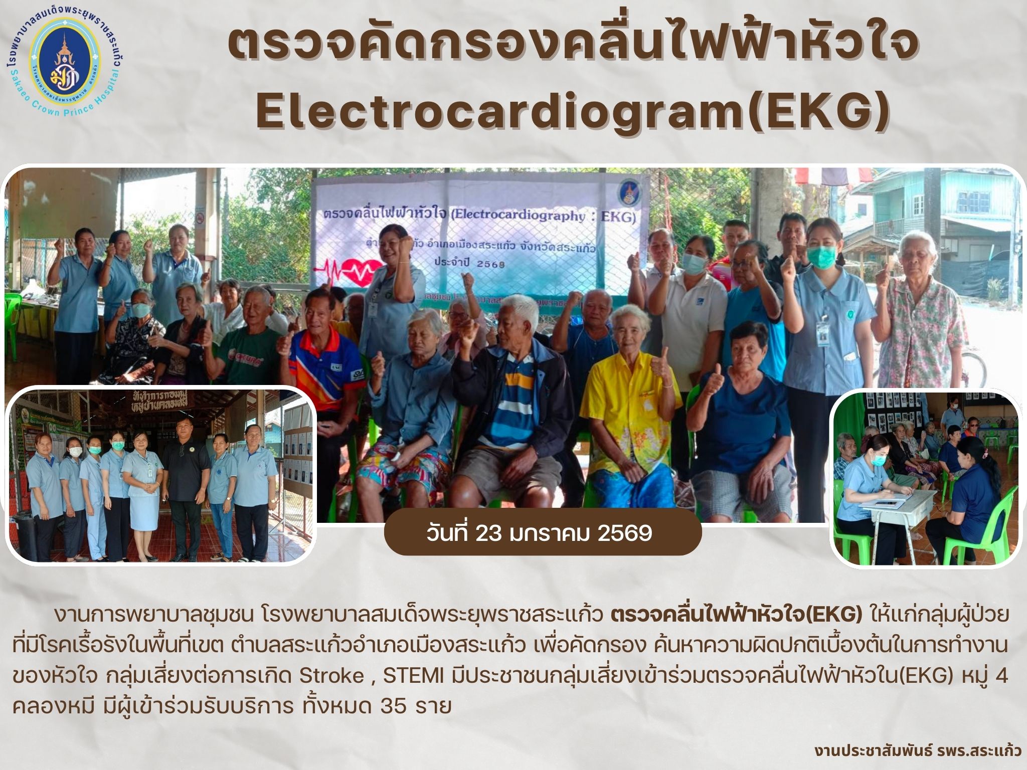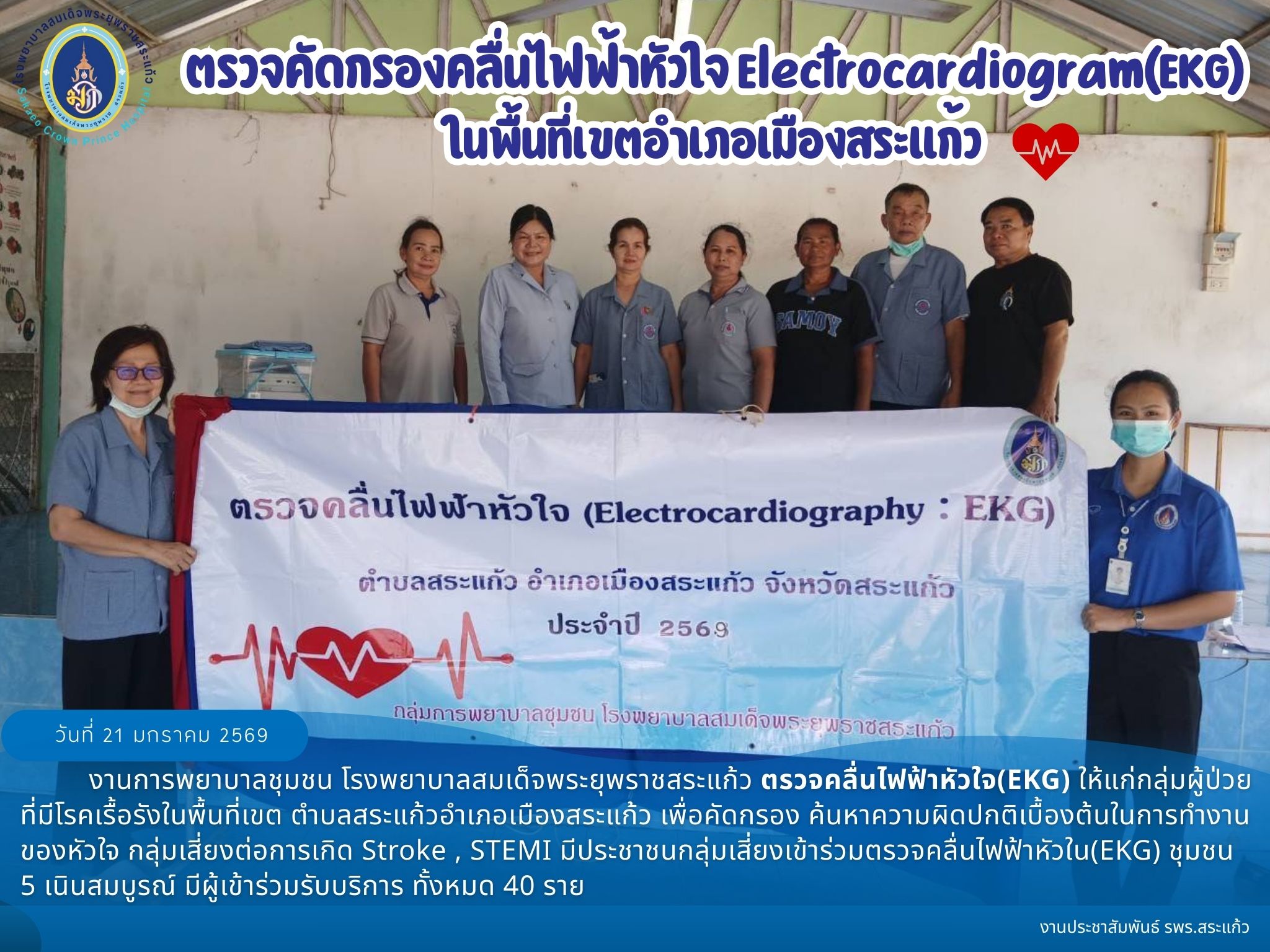 สุภาพร ภูจิตทอง ประชาสัมพันธ์กิจกรรมบริการ 21 January 2026 Hits: 1131 การตรวจคัดกรองคลื่นไฟฟ้าหัวใจ Electrocardiogram(EKG)ในพื้นที่เขตอำเภอเมืองสระแก้ว Print Email