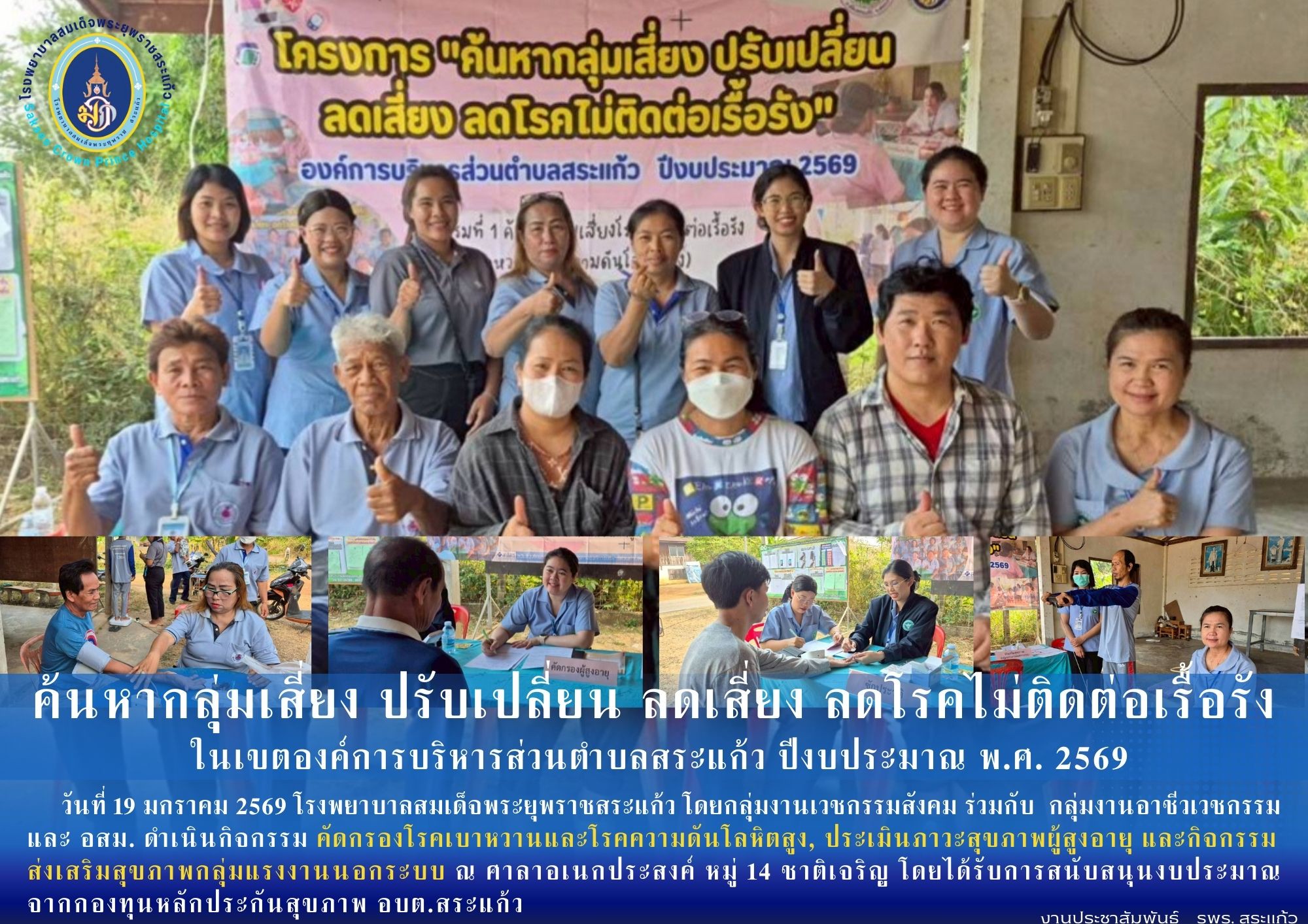 สุภาพร ภูจิตทอง ประชาสัมพันธ์กิจกรรมบริการ 20 January 2026 Hits: 1237 โครงการ ค้นหากลุ่มเสี่ยง ปรับเปลี่ยน ลดเสี่ยง ลดโรคไม่ติดต่อเรื้อรัง ในเขตองค์การบริหารส่วนตำบลสระแก้ว ปีงบประมาณ พ.ศ. 2569 Print Email