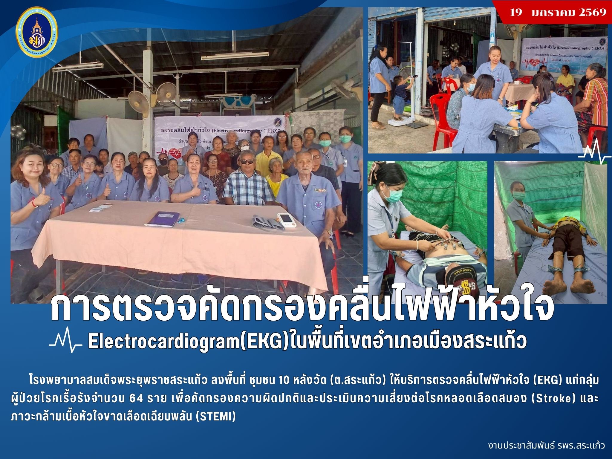 สุภาพร ภูจิตทอง ประชาสัมพันธ์กิจกรรมบริการ 20 January 2026 Hits: 1360 การตรวจคัดกรองคลื่นไฟฟ้าหัวใจ Electrocardiogram(EKG)ในพื้นที่เขตอำเภอเมืองสระแก้ว Print Email