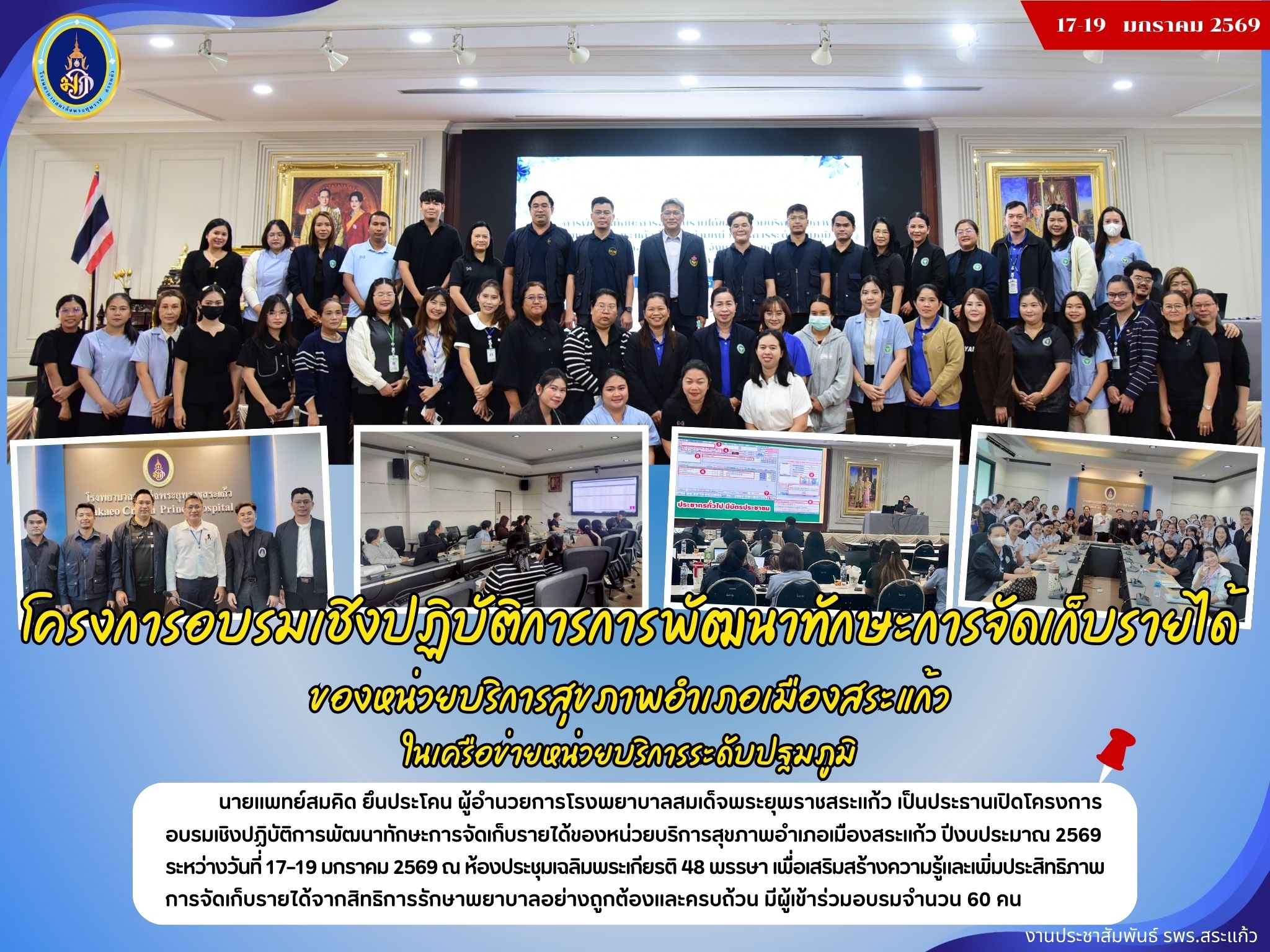 สุภาพร ภูจิตทอง ประชาสัมพันธ์กิจกรรมบริการ 20 January 2026 Hits: 1364 โครงการอบรมเชิงปฏิบัติการการพัฒนาทักษะการจัดเก็บรายได้ของหน่วยบริการสุขภาพอำเภอเมืองสระแก้ว Print Email
