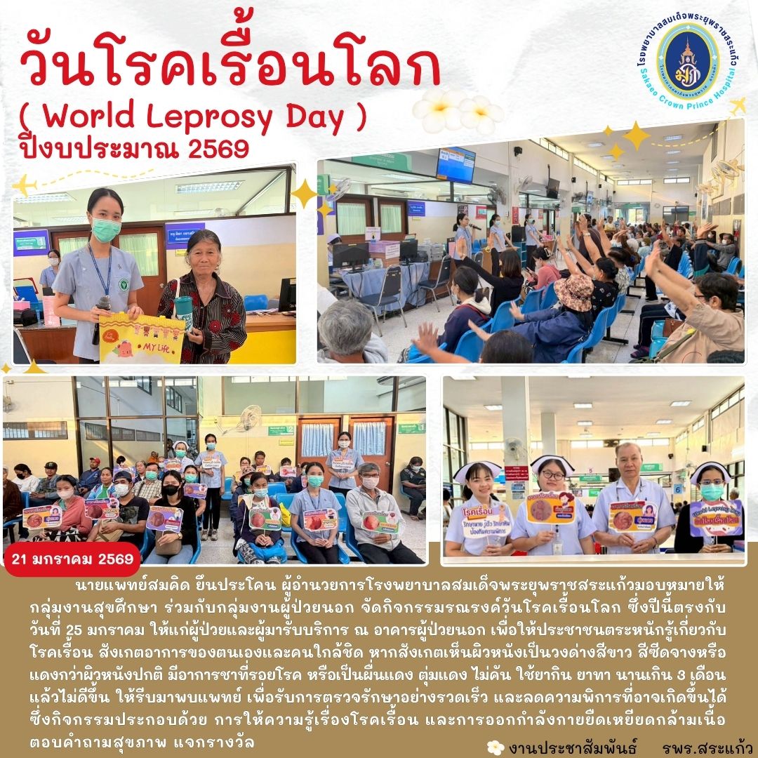สุภาพร ภูจิตทอง ประชาสัมพันธ์กิจกรรมบริการ 21 January 2026 Hits: 1132 วันโรคเรื้อนโลก ปีงบประมาณ 2569 ( World Leprosy Day ) Print Email