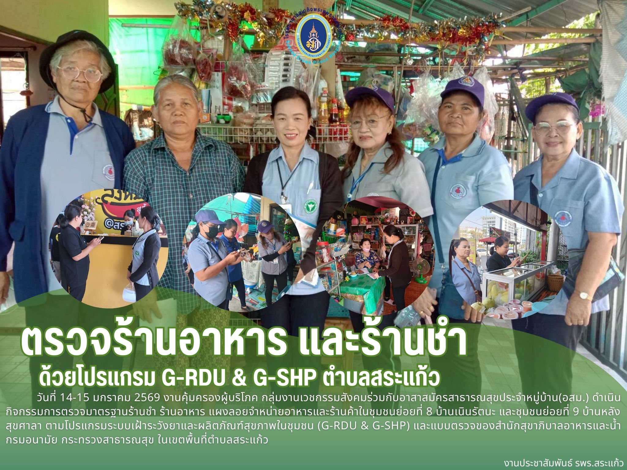 สุภาพร ภูจิตทอง ประชาสัมพันธ์กิจกรรมบริการ 16 January 2026 Hits: 1006 กิจกรรมการตรวจร้านอาหาร และร้านชำ ด้วยโปรแกรม G-RDU & G-SHP ตำบลสระแก้ว Print Email