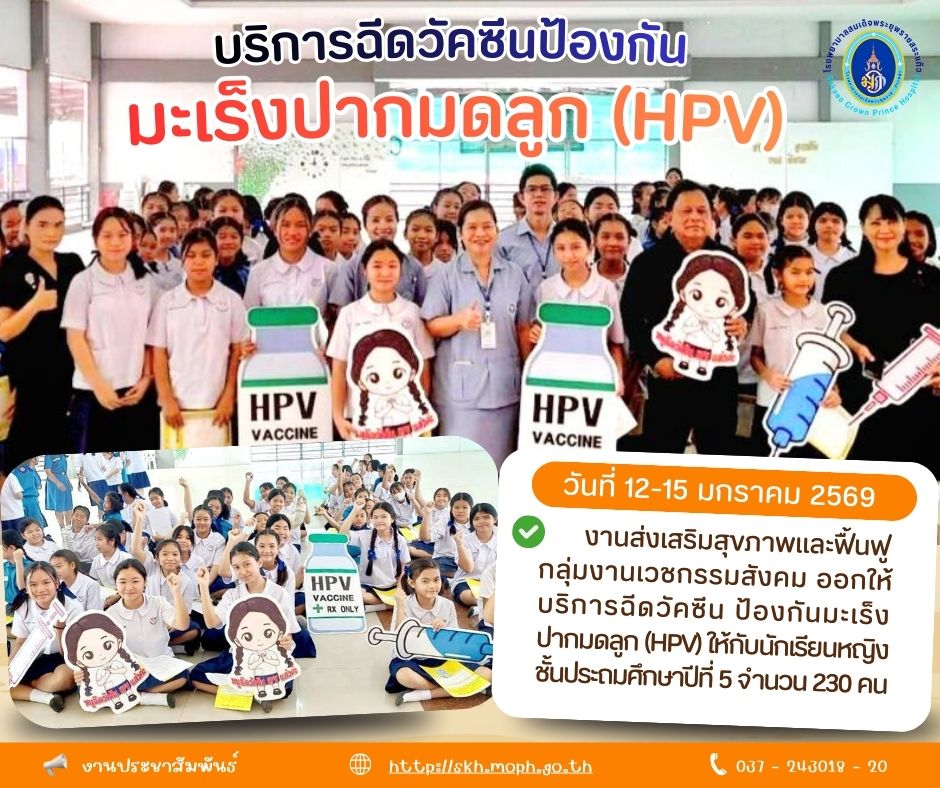 สุภาพร ภูจิตทอง ประชาสัมพันธ์กิจกรรมบริการ 16 January 2026 Hits: 1238 บริการฉีดวัคซีนป้องกันมะเร็งปากมดลูก (HPV) Print Email