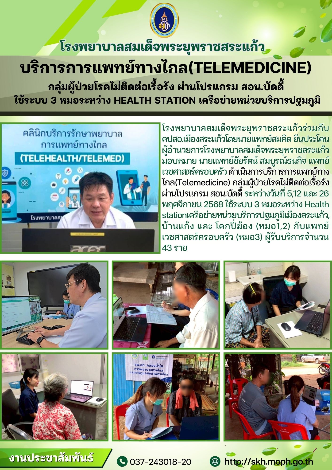 สุภาพร ภูจิตทอง ประชาสัมพันธ์กิจกรรมบริการ 28 November 2025 Hits: 249 บริการการแพทย์ทางไกล(Telemedicine)กลุ่มผู้ป่วยโรคไม่ติดต่อเรื้อรัง ผ่านโปรแกรม สอน.บัดดี้ ใช้ระบบ 3 หมอระหว่าง Health station เครือข่ายหน่วยบริการปฐมภูมิเมืองสระแก้ว,บ้านแก้ง และโคกปี่ฆ้อง Print Email