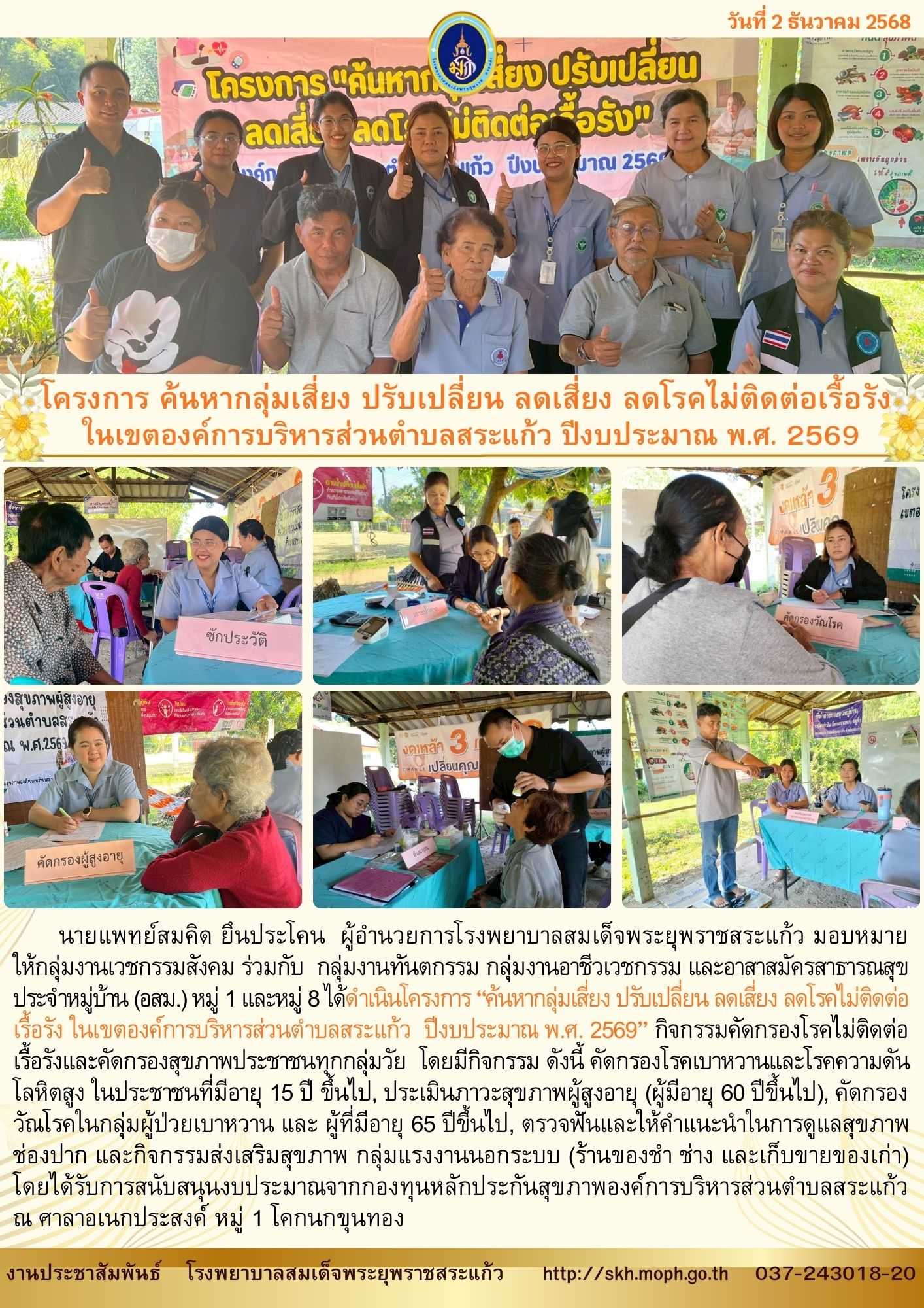 สุภาพร ภูจิตทอง ประชาสัมพันธ์กิจกรรมบริการ 03 December 2025 Hits: 1192 โครงการ ค้นหากลุ่มเสี่ยง ปรับเปลี่ยน ลดเสี่ยง ลดโรคไม่ติดต่อเรื้อรัง ในเขตองค์การบริหารส่วนตำบลสระแก้ว ปีงบประมาณ พ.ศ. 2569 Print Email