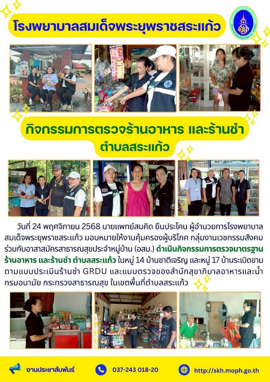 สุภาพร ภูจิตทอง ประชาสัมพันธ์กิจกรรมบริการ 26 November 2025 Hits: 186 กิจกรรมการตรวจร้านอาหาร และร้านชำ ตำบลสระแก้ว Print Email