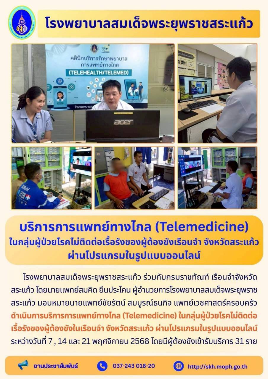 สุภาพร ภูจิตทอง ประชาสัมพันธ์กิจกรรมบริการ 25 November 2025 Hits: 222 บริการการแพทย์ทางไกล (Telemedicine) ในกลุ่มผู้ป่วยโรคไม่ติดต่อเรื้อรังของผู้ต้องขังเรือนจำ จังหวัดสระแก้ว ผ่านโปรแกรมในรูปแบบออนไลน์ Print Email