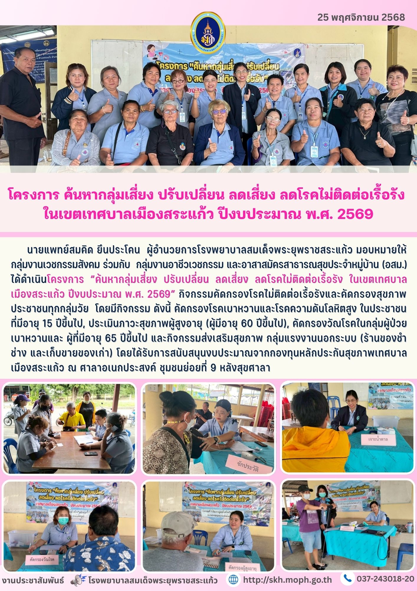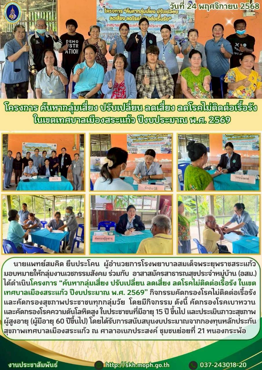 สุภาพร ภูจิตทอง ประชาสัมพันธ์กิจกรรมบริการ 25 November 2025 Hits: 225 โครงการ ค้นหากลุ่มเสี่ยง ปรับเปลี่ยน ลดเสี่ยง ลดโรคไม่ติดต่อเรื้อรัง ในเขตเทศบาลเมืองสระแก้ว ปีงบประมาณ พ.ศ. 2569 Print Email