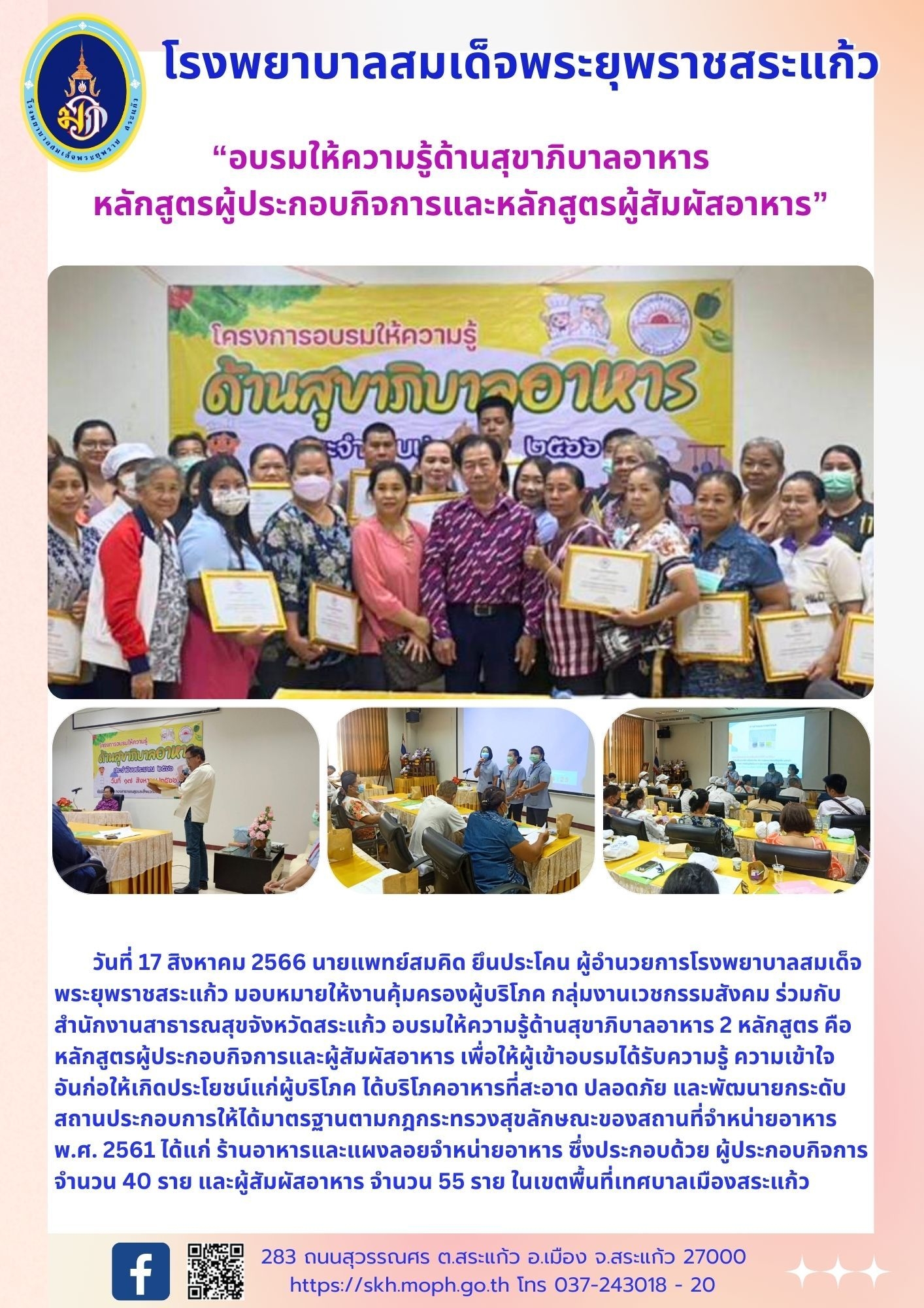 สุภาพร ภูจิตทอง ประชาสัมพันธ์กิจกรรมบริการ 25 August 2023 Hits: 18 “อบรมให้ความรู้ด้านสุขาภิบาลอาหาร หลักสูตรผู้ประกอบกิจการและหลักสูตรผู้สัมผัสอาหาร” Print Email