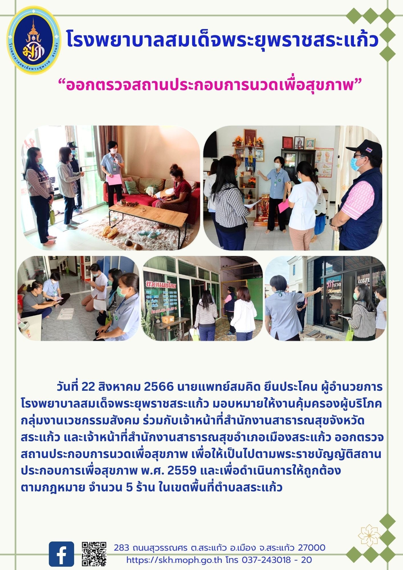 สุภาพร ภูจิตทอง ประชาสัมพันธ์กิจกรรมบริการ 25 August 2023 Hits: 16 “ออกตรวจสถานประกอบการนวดเพื่อสุขภาพ” Print Email