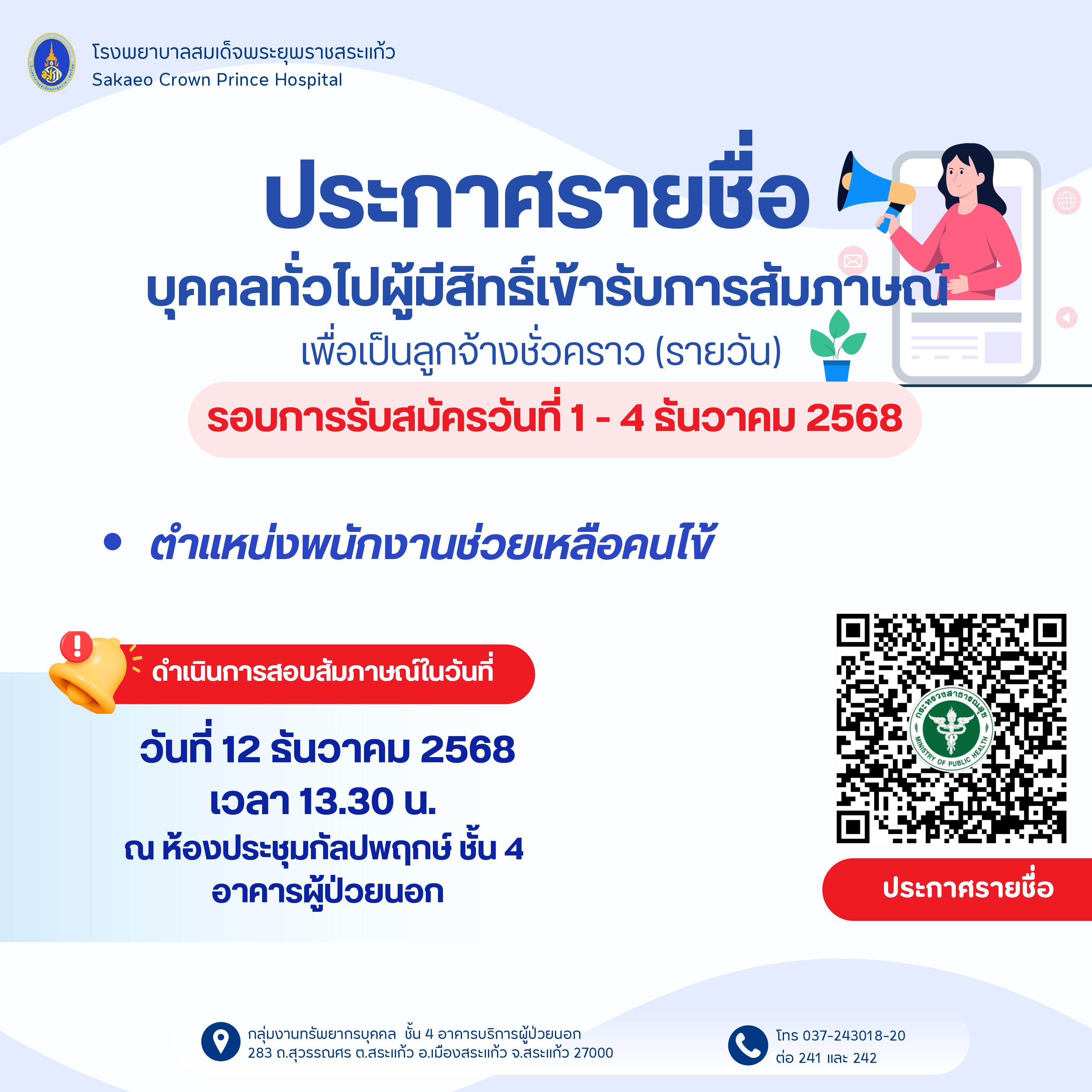 กมลทิพย์ ธรรมวรางกูร รับสมัครงาน 04 December 2025 Hits: 1557 ประกาศรายชื่อผู้มีสิทธิเข้ารับการสอบสัมภาษณ์เป็นลูกจ้างชั่วคราว(รายวัน) Print Email ตำแหน่งพนักงานช่วยเหลือคนไข้ Attachments: D34.pdf[ ]804 kB Prev Next