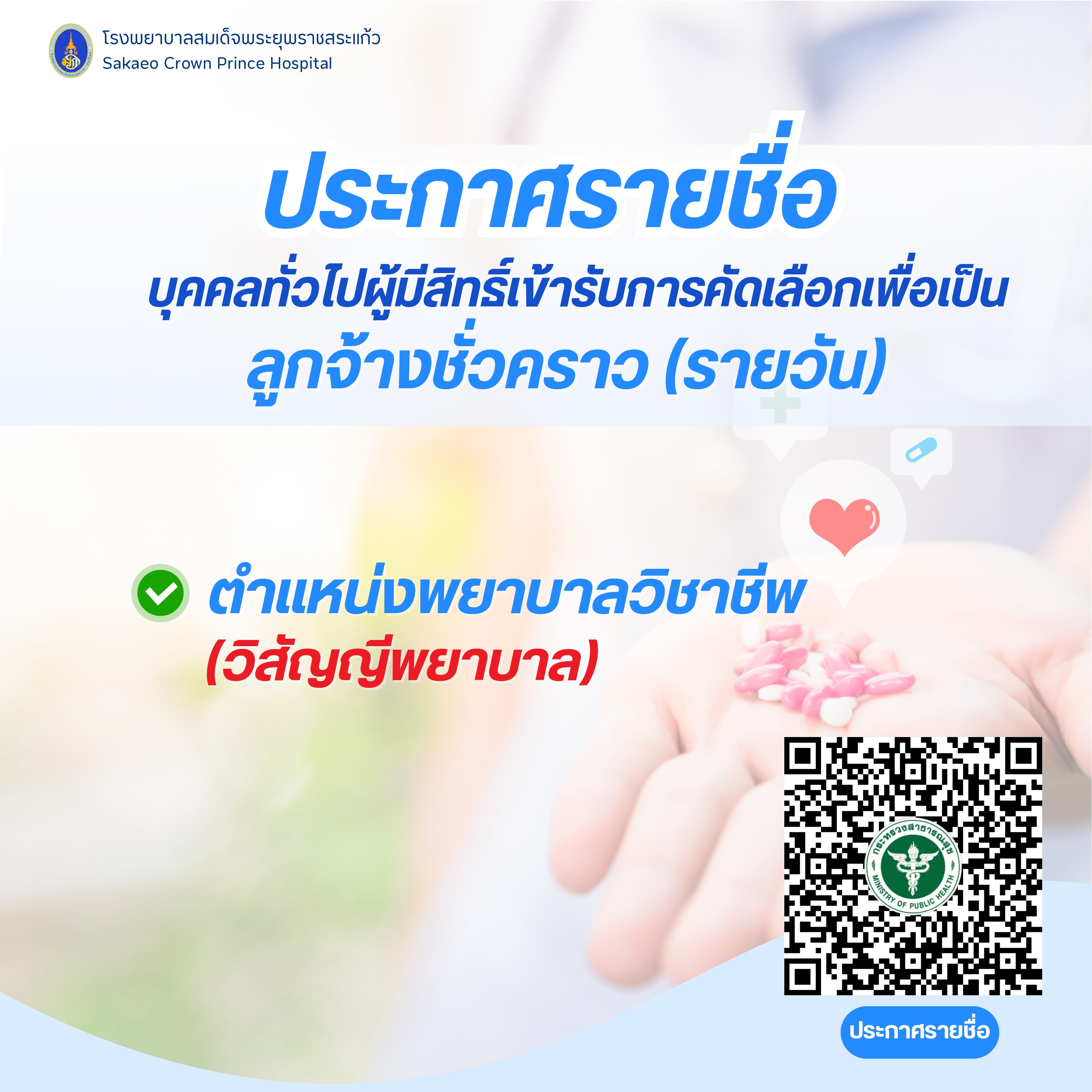กมลทิพย์ ธรรมวรางกูร รับสมัครงาน 25 December 2025 Hits: 1531 ประกาศรายชื่อผู้มีสิทธิ์เข้ารับการคัดเลือกเพื่อเป็นลูกจ้างชั่วคราว(รายวัน) Print Email ตำแหน่งพยาบาลวิชาชีพ (วิสัญญีพยาบาล) Attachments: D43.pdf[ ]1159 kB Prev Next
